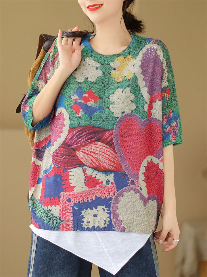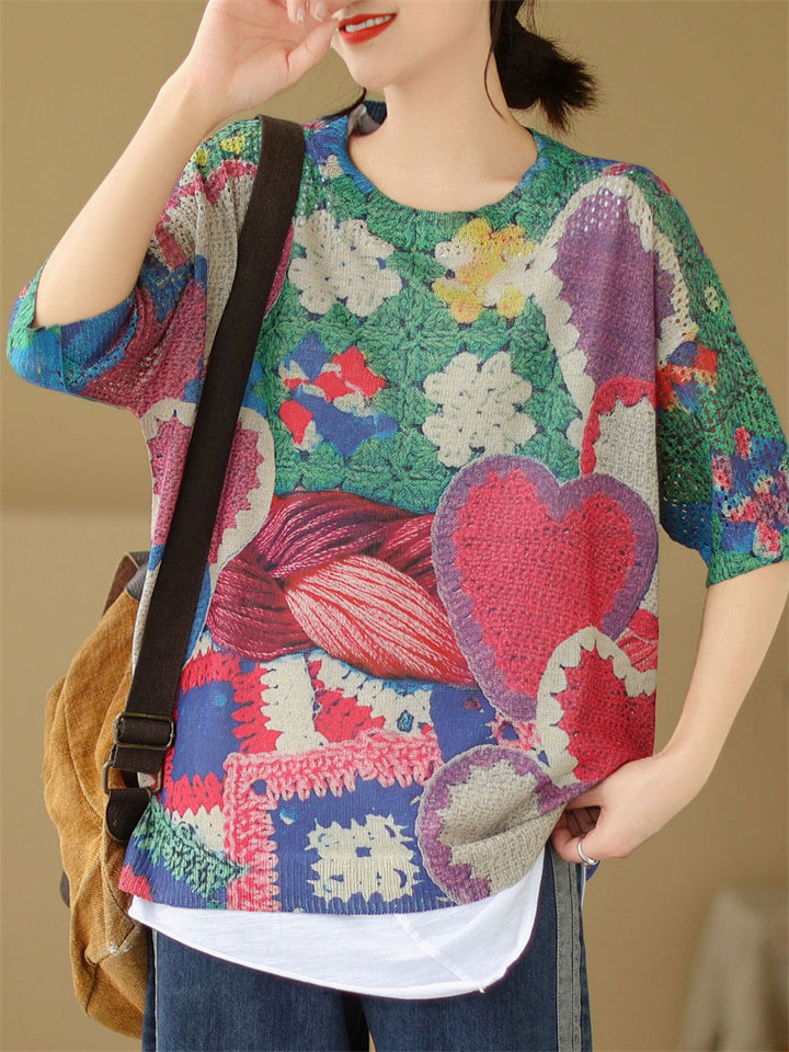Peach Heart & Flower Print Round Neck Knitted T-shirts for Women