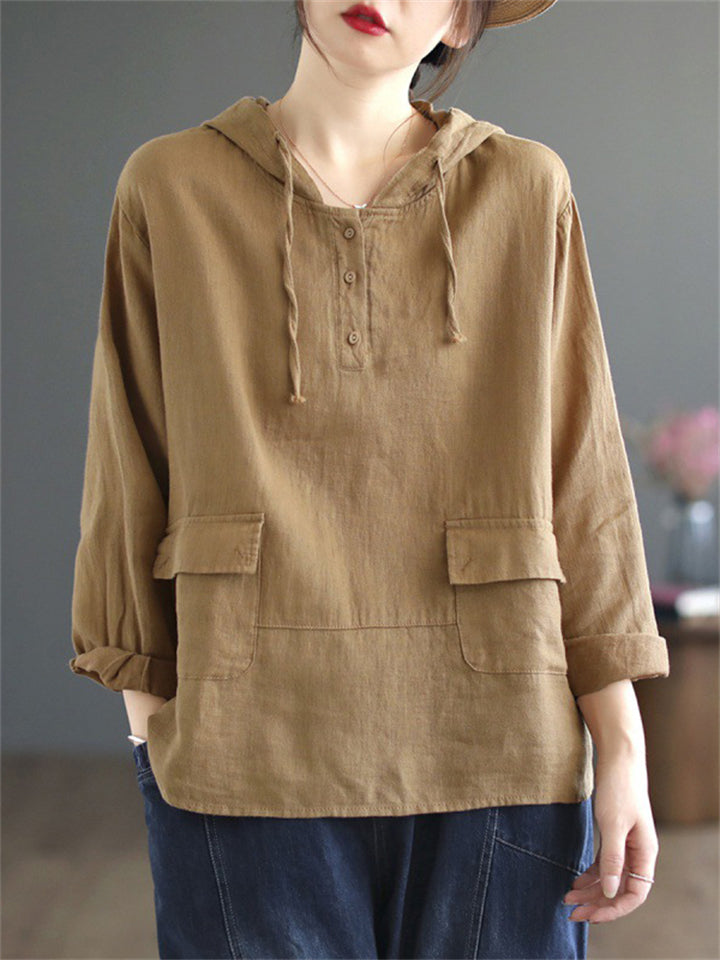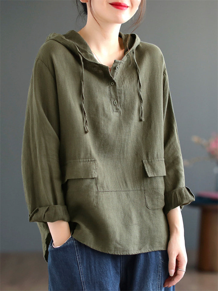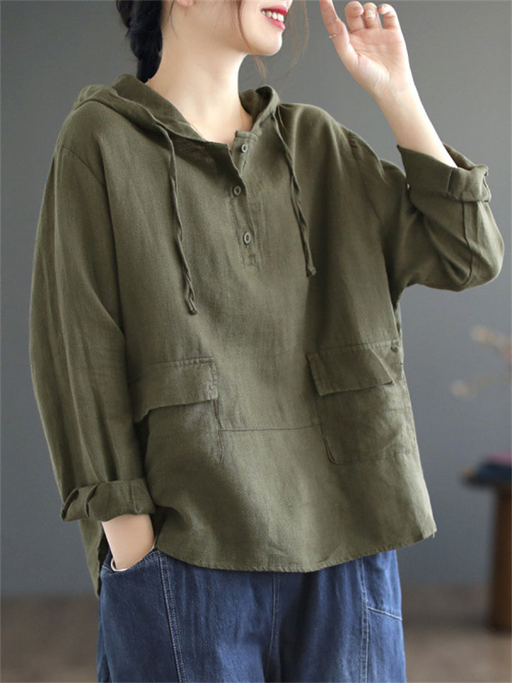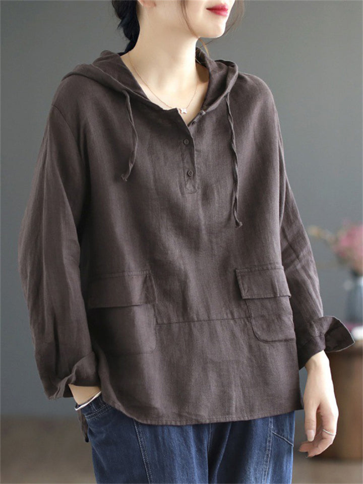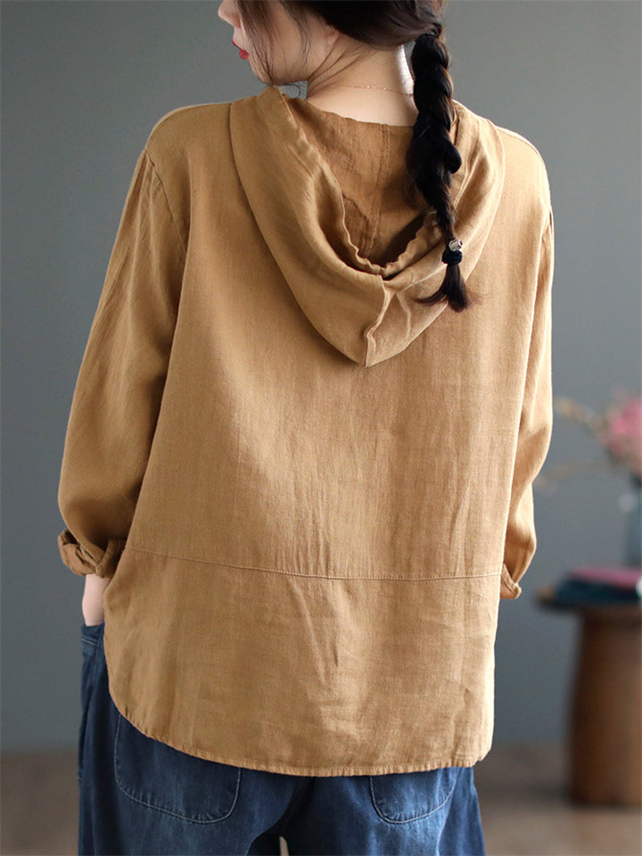 Plain Cotton Linen Long Sleeve Hooded Shirt for Women