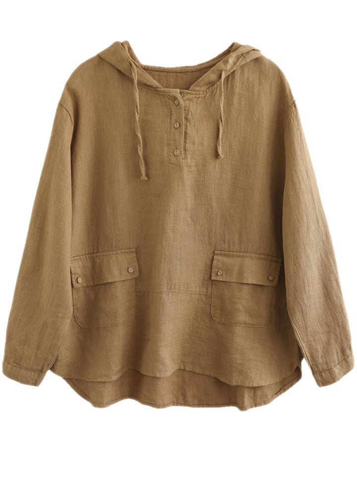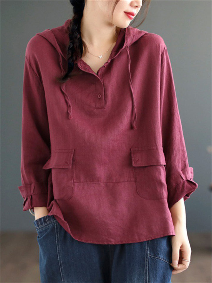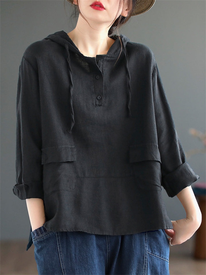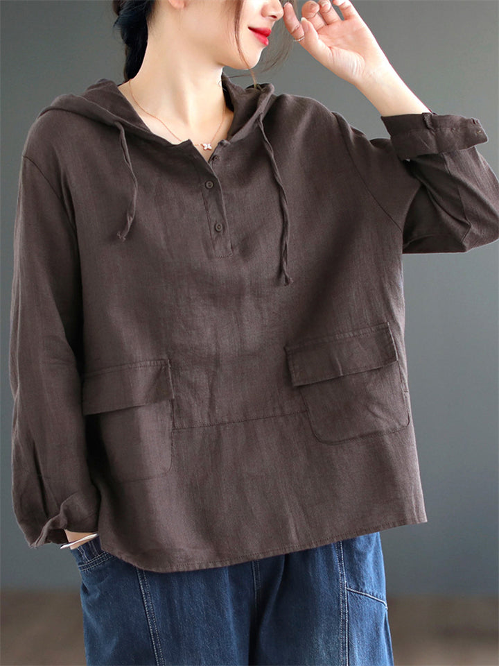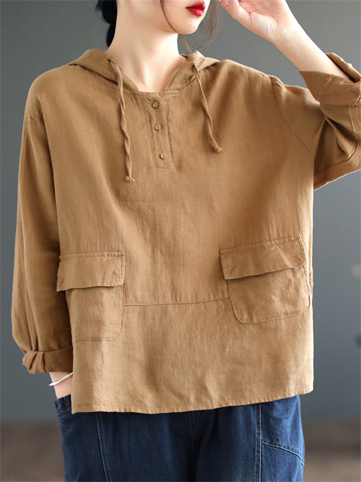 Plain Cotton Linen Long Sleeve Hooded Shirt for Women