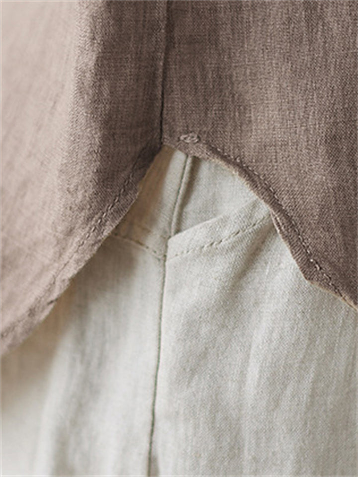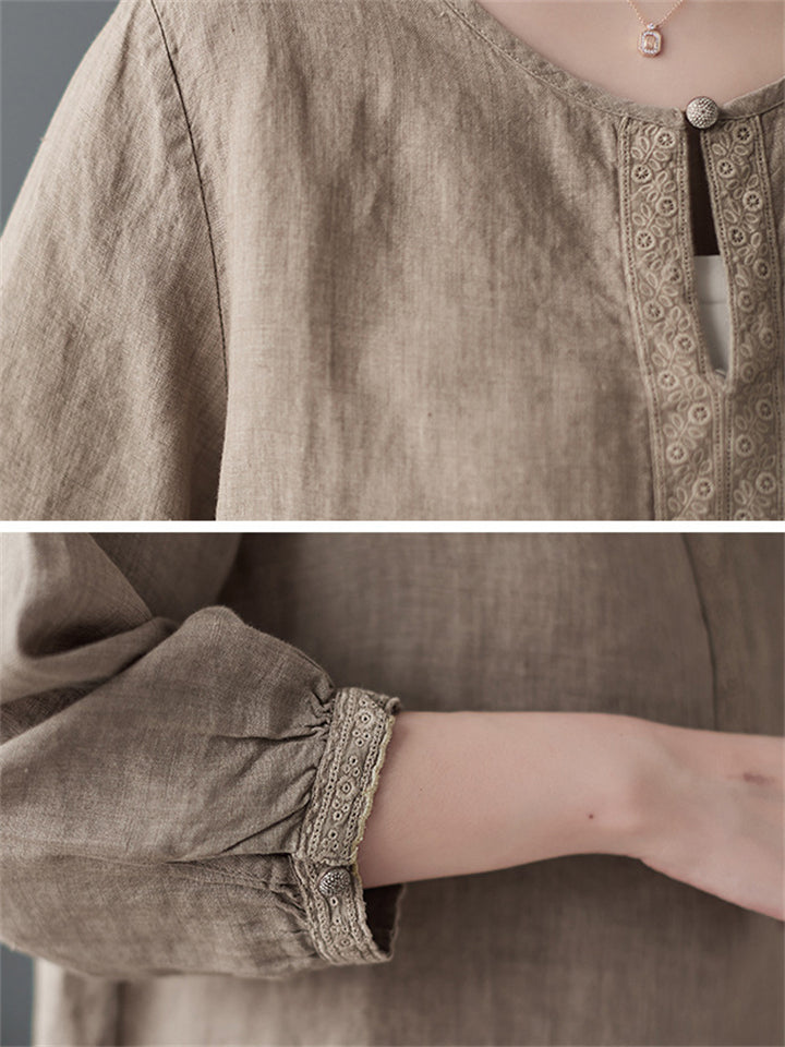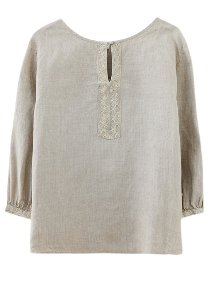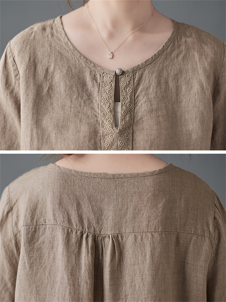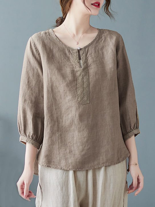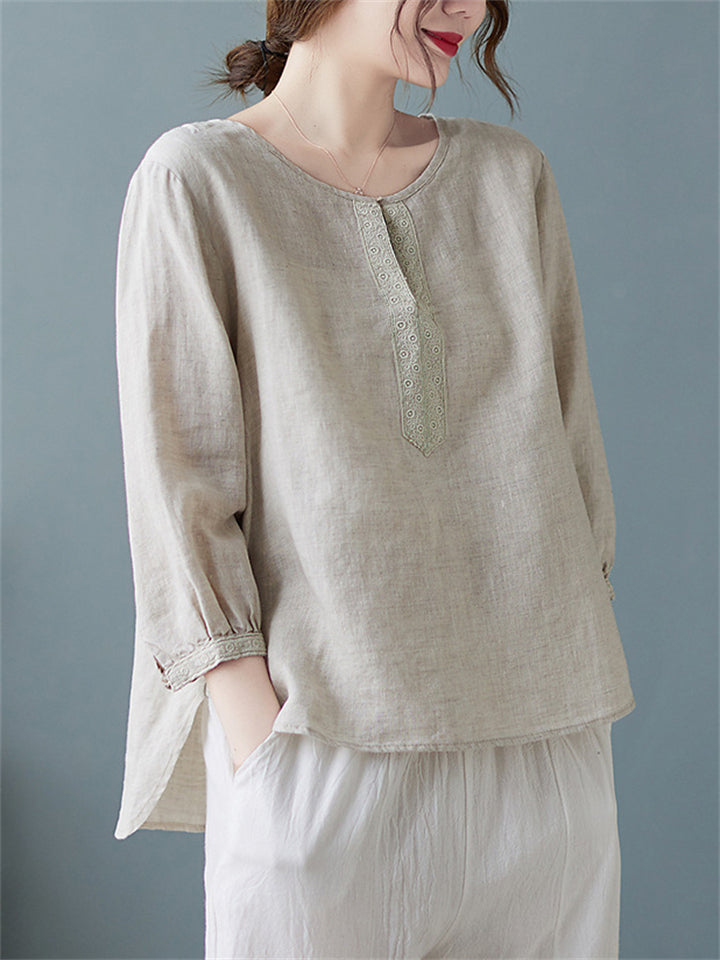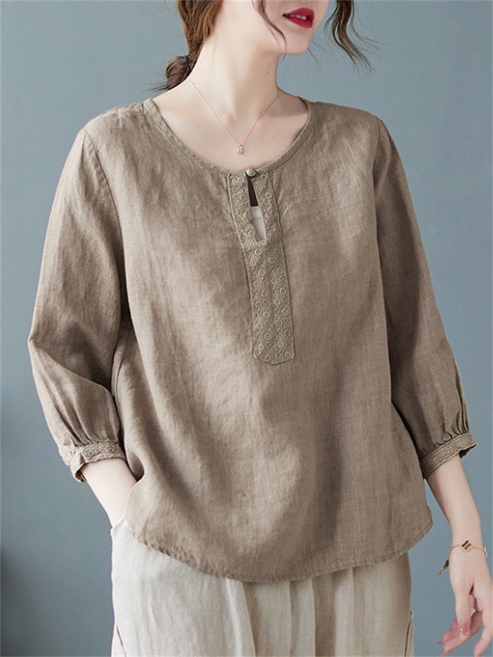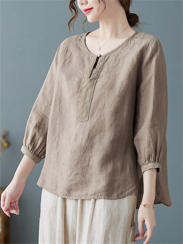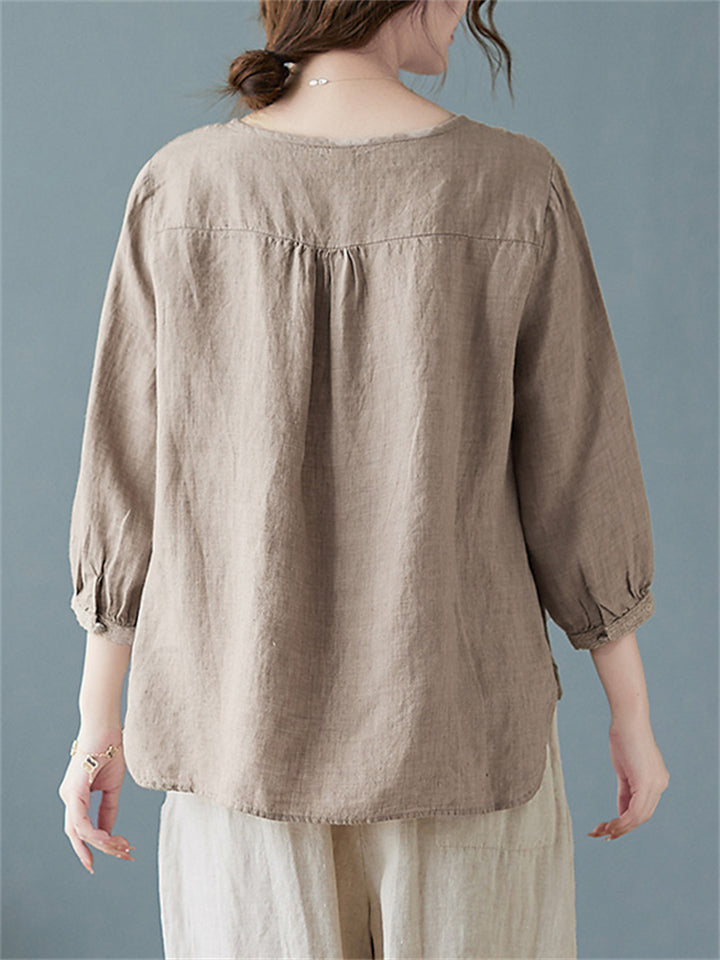 Plain Scoop Neck 3/4 Sleeve Female Cozy Linen Shirt