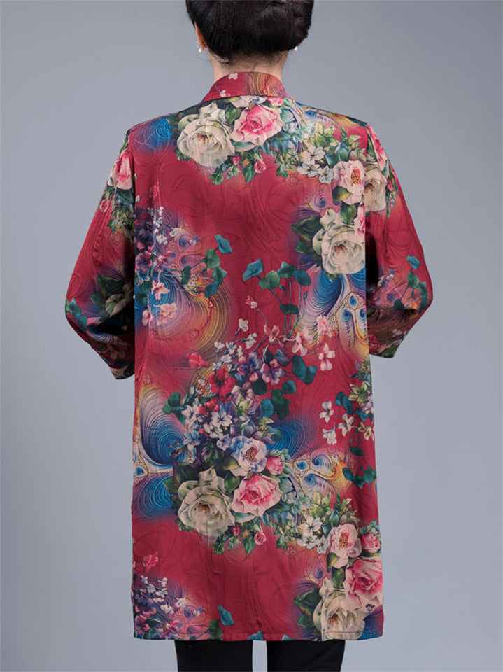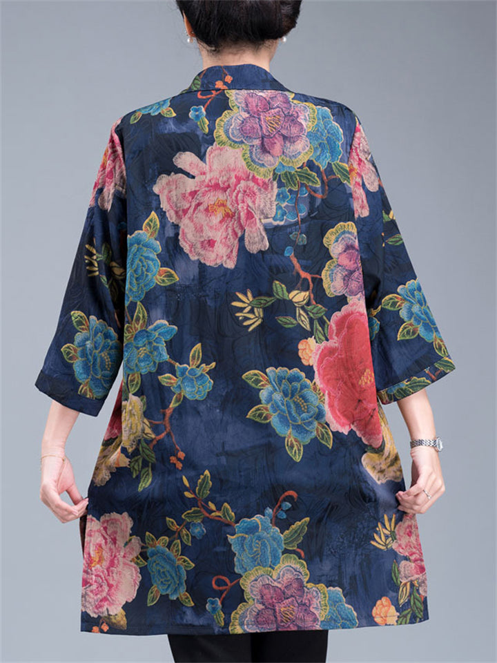 Lady Stand-up Collar Floral Printed Chinese Style Shirts