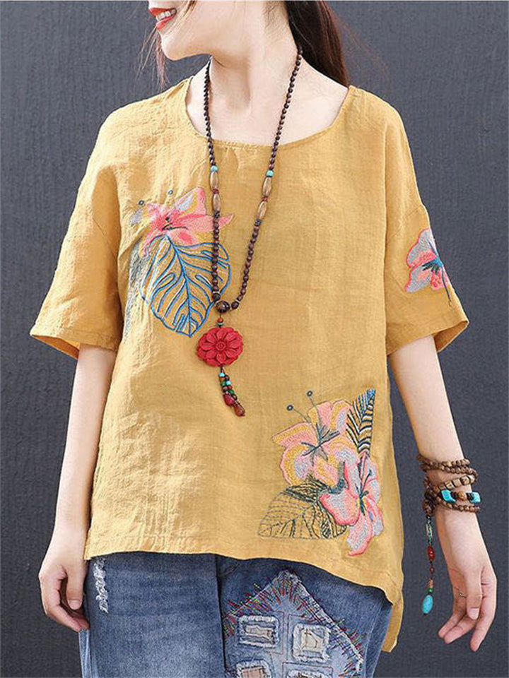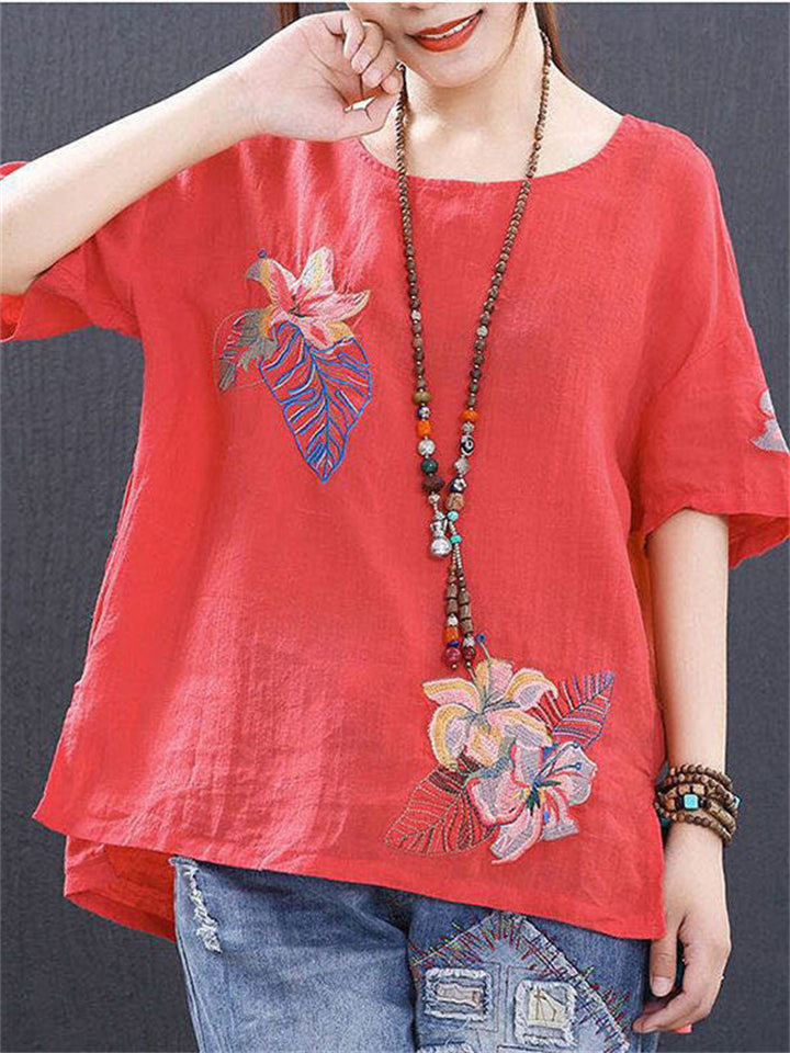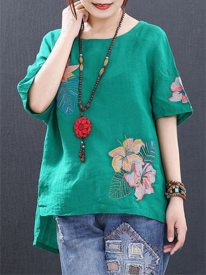 Ladies Ethnic Style Floral Embroidery Round Neck Shirts
