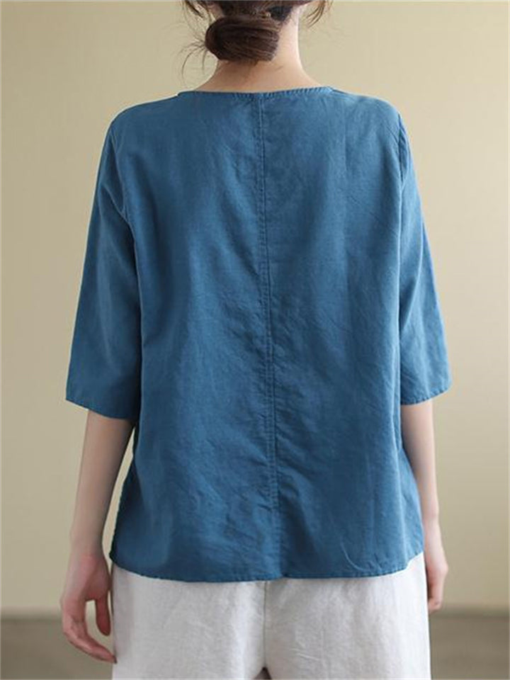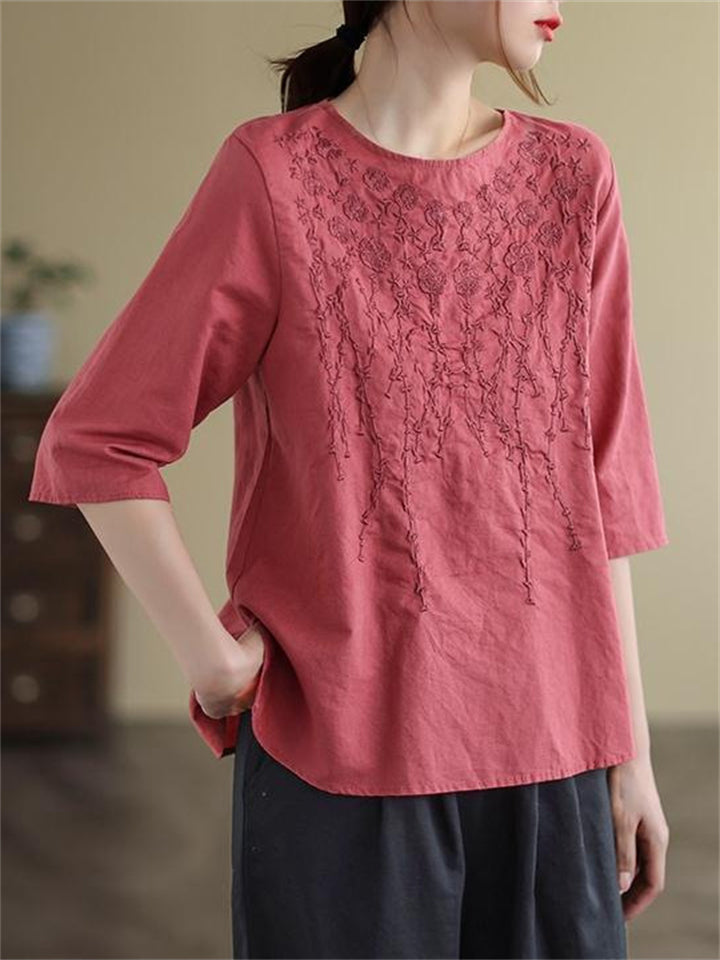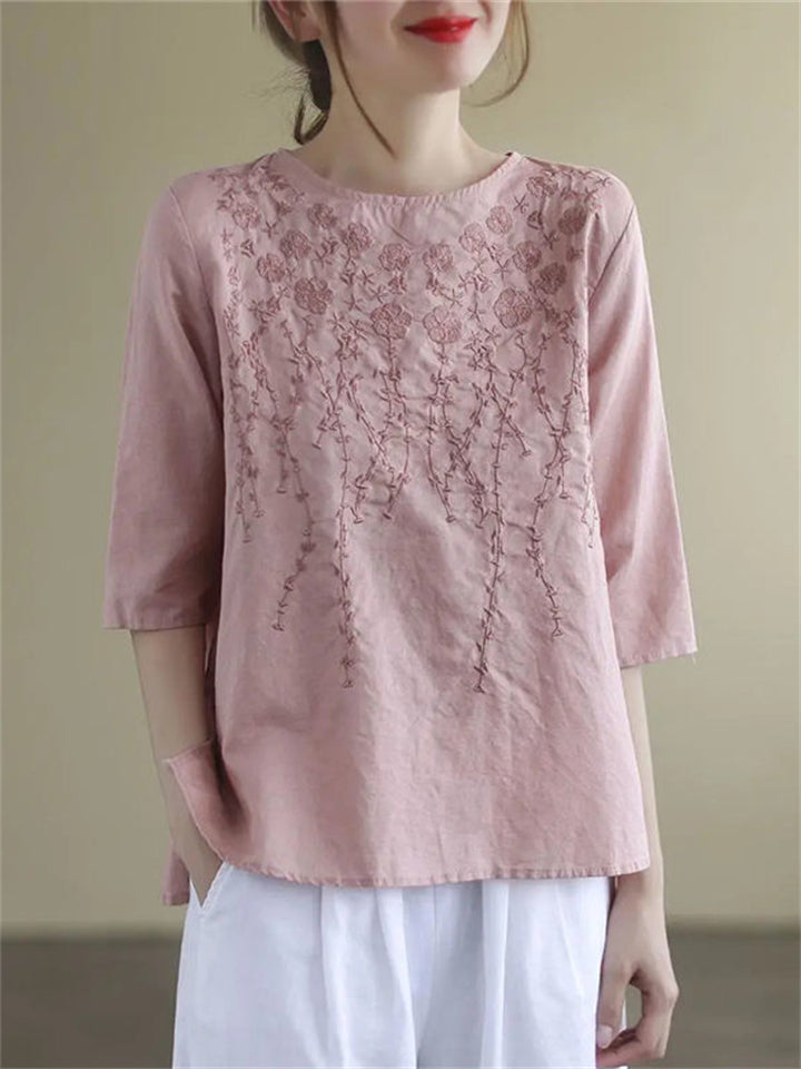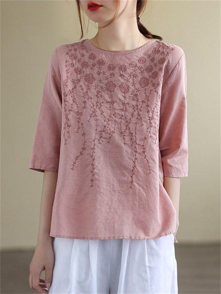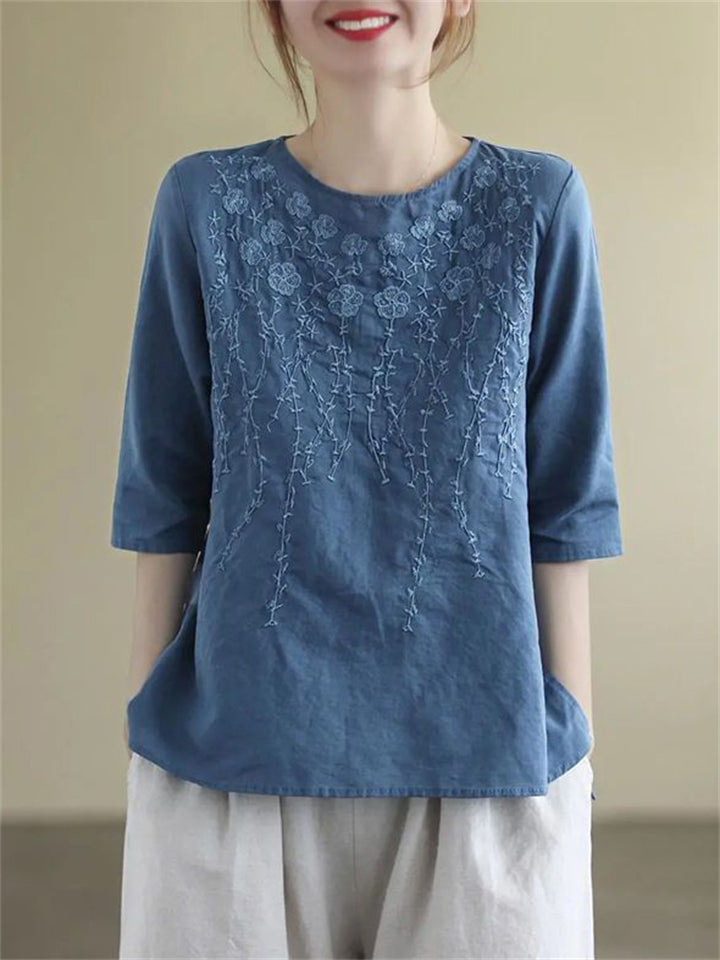 Ladies Ethnic Style Floral Embroidery Round Neck Shirts