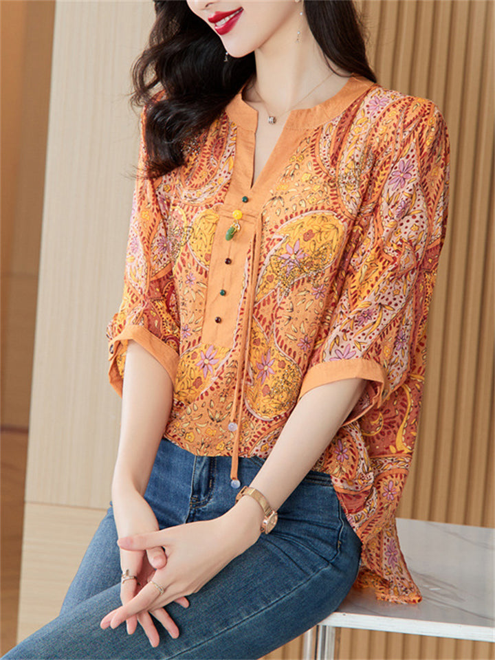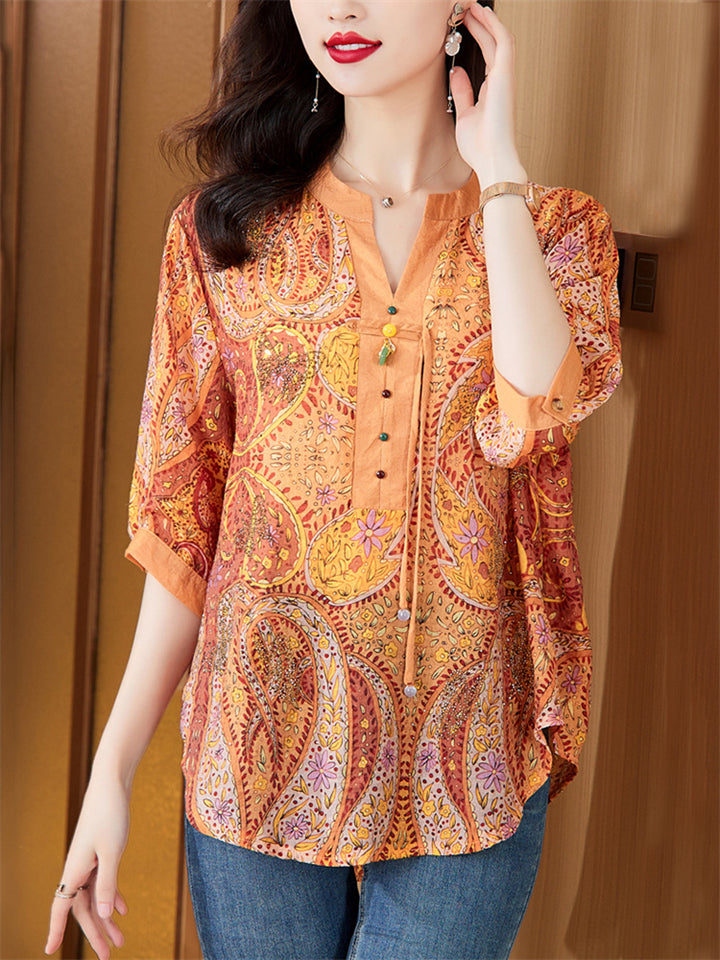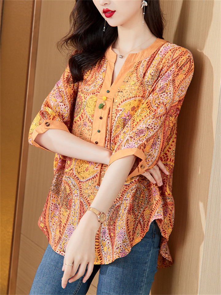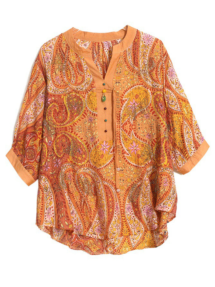 Retro Orange Paisley Print V Neck Half Sleeve Shirt for Women