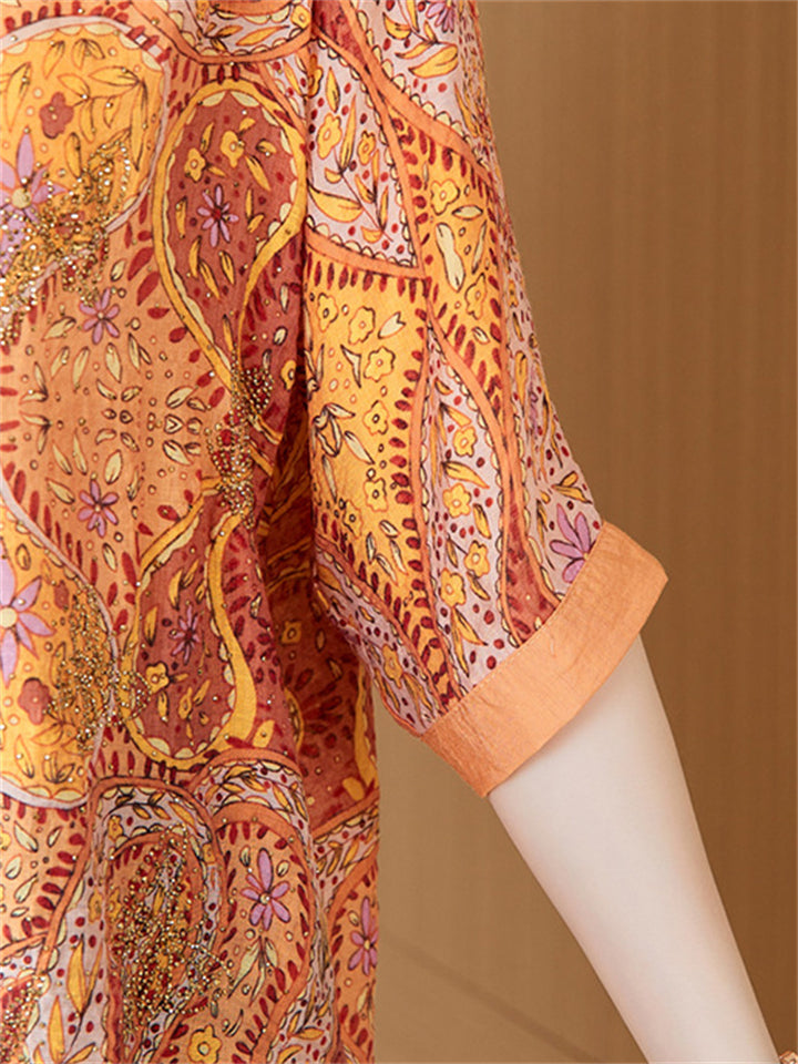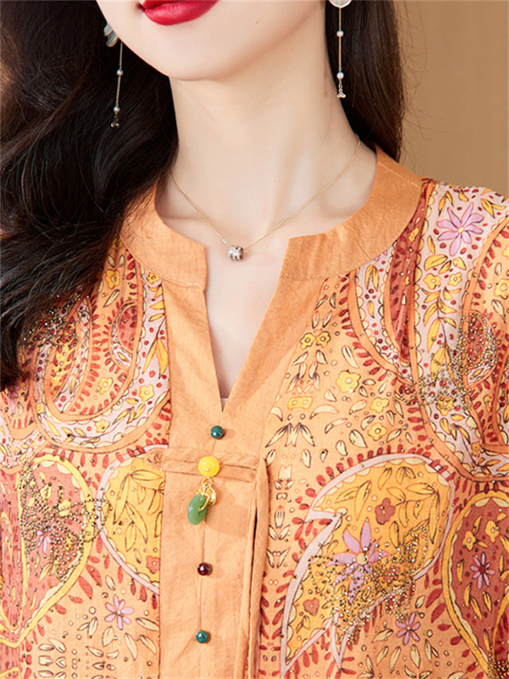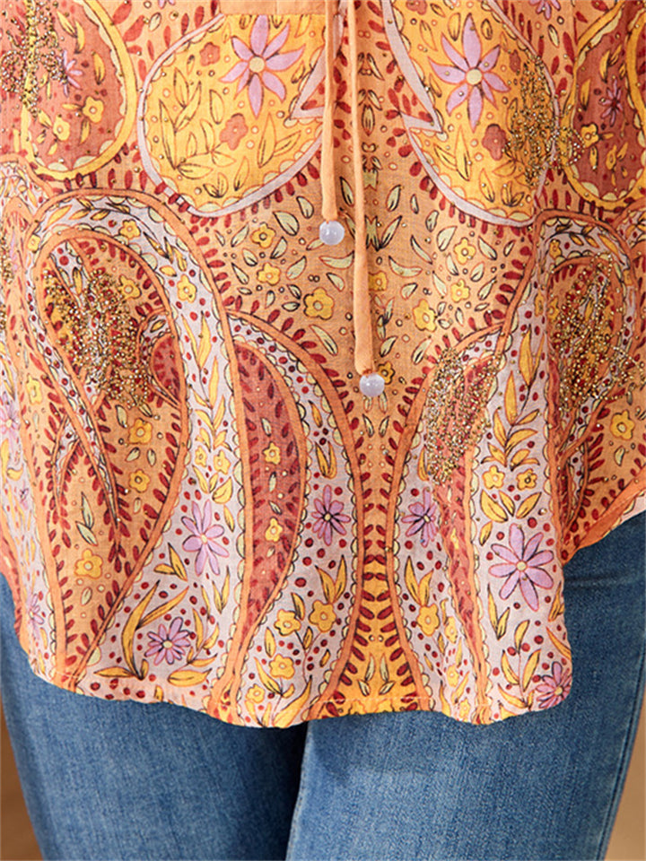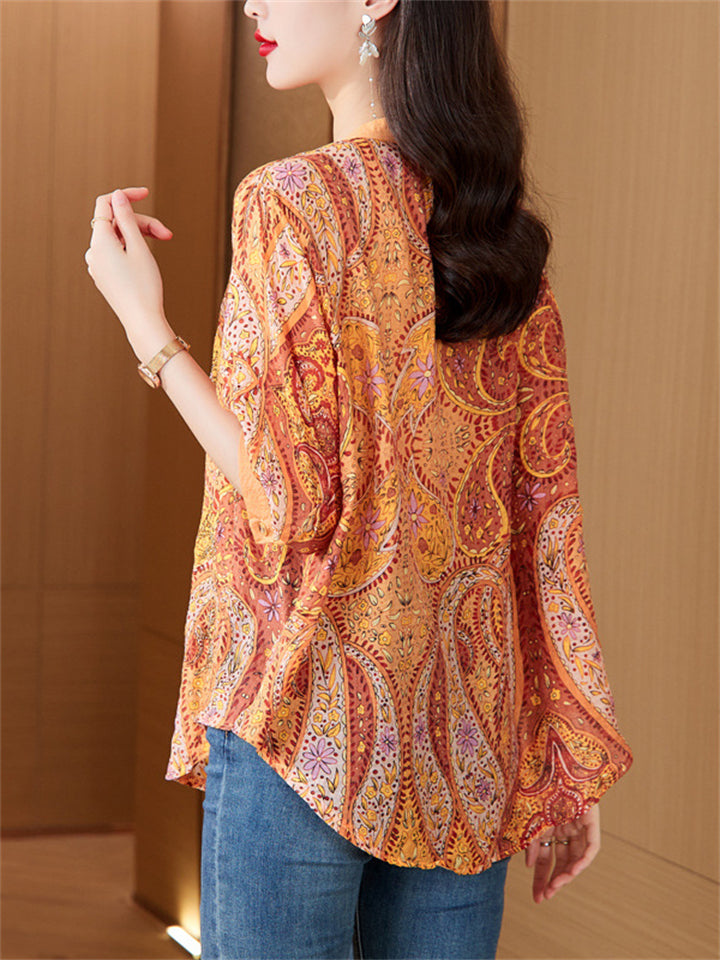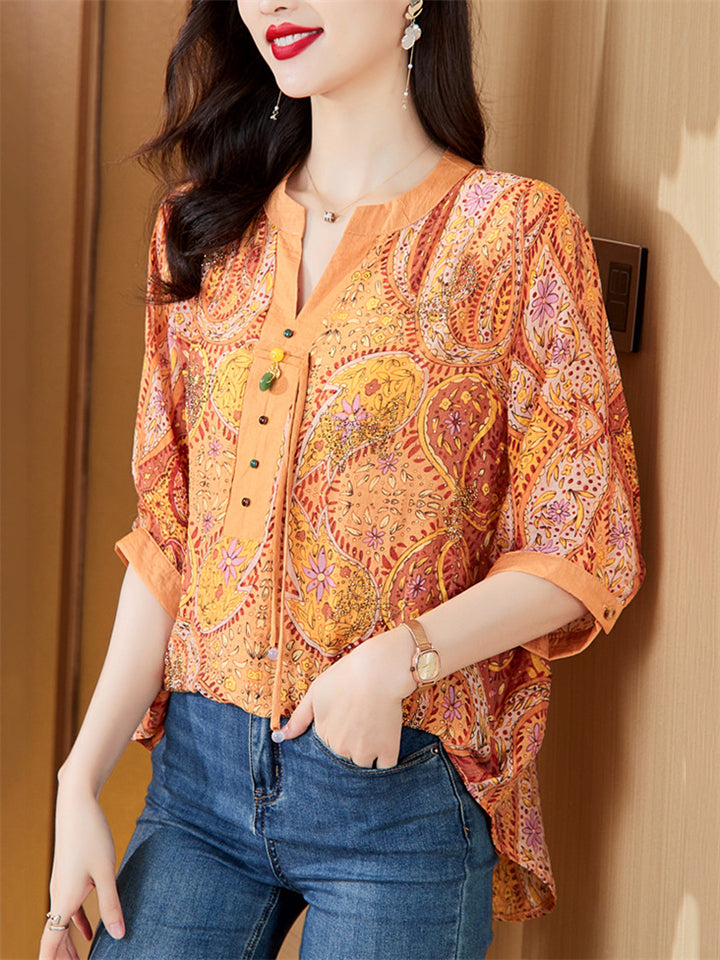 Retro Orange Paisley Print V Neck Half Sleeve Shirt for Women