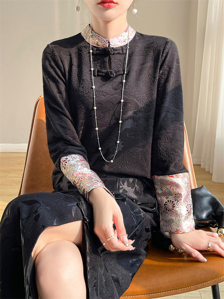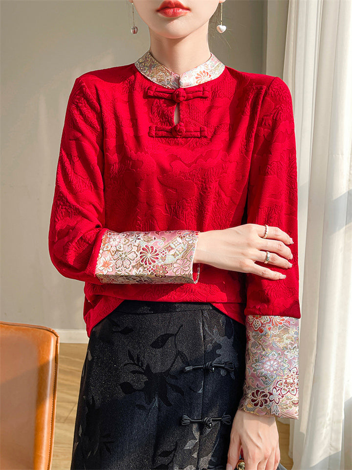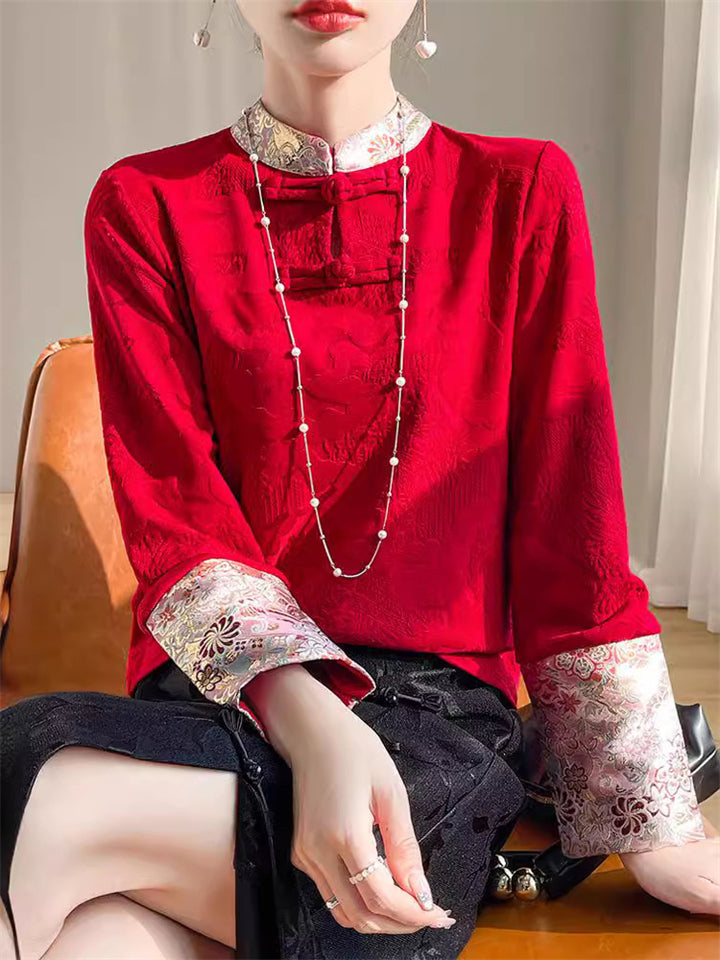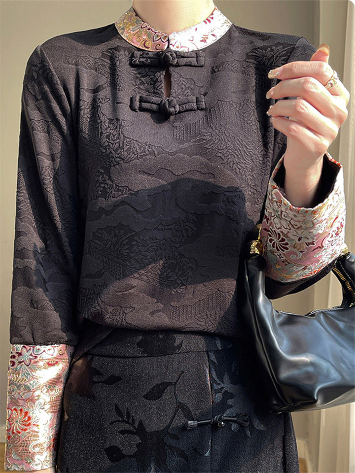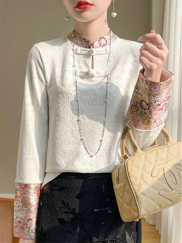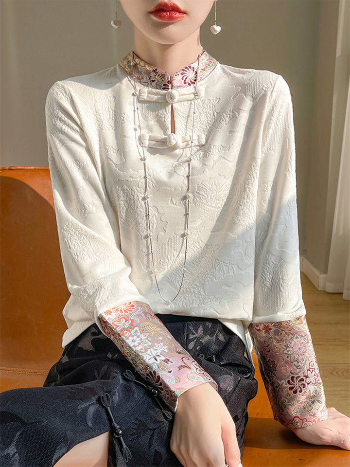 Spring Patchwork Stand Collar Long Sleeve Shirt for Women