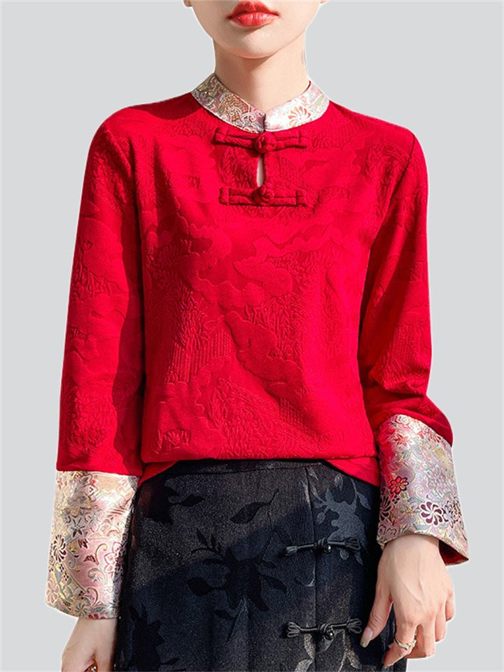 Lady Stand-up Collar Floral Printed Chinese Style Shirts