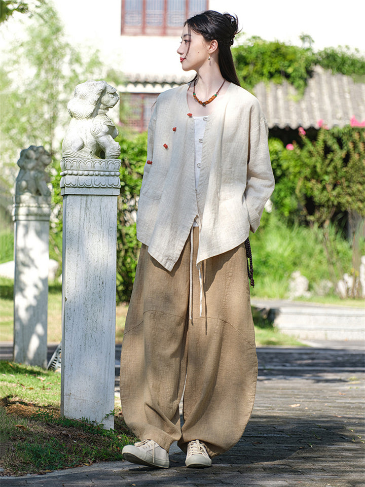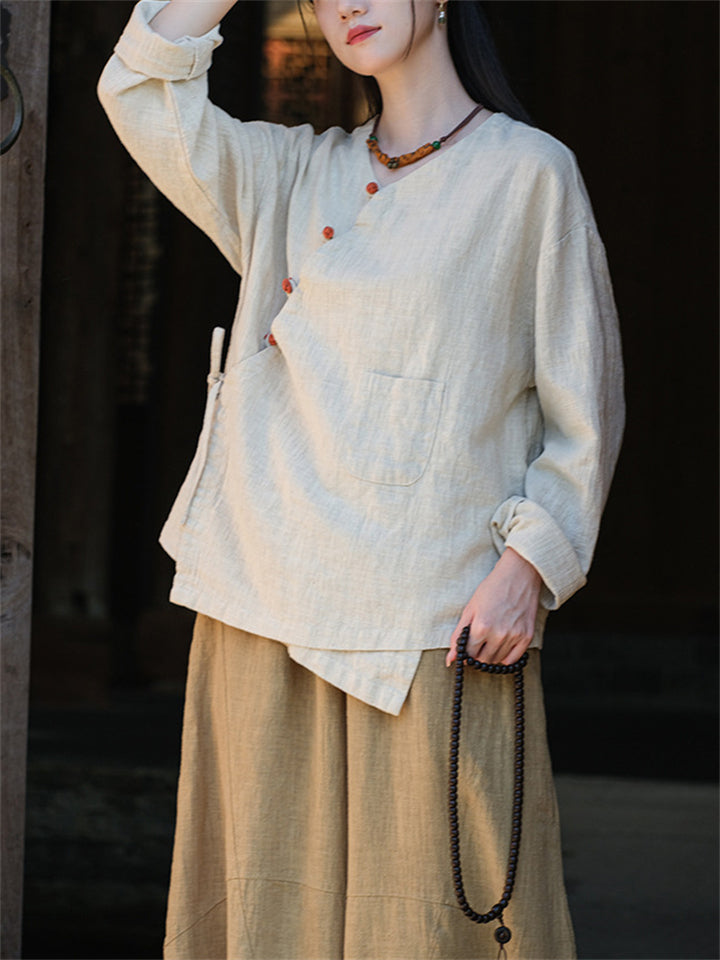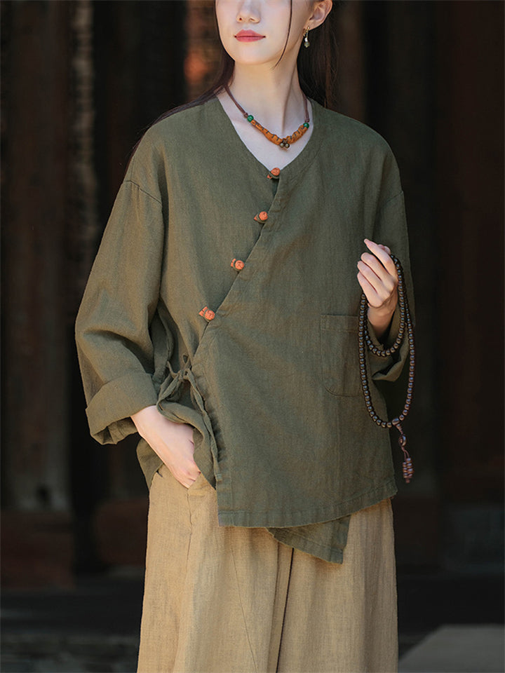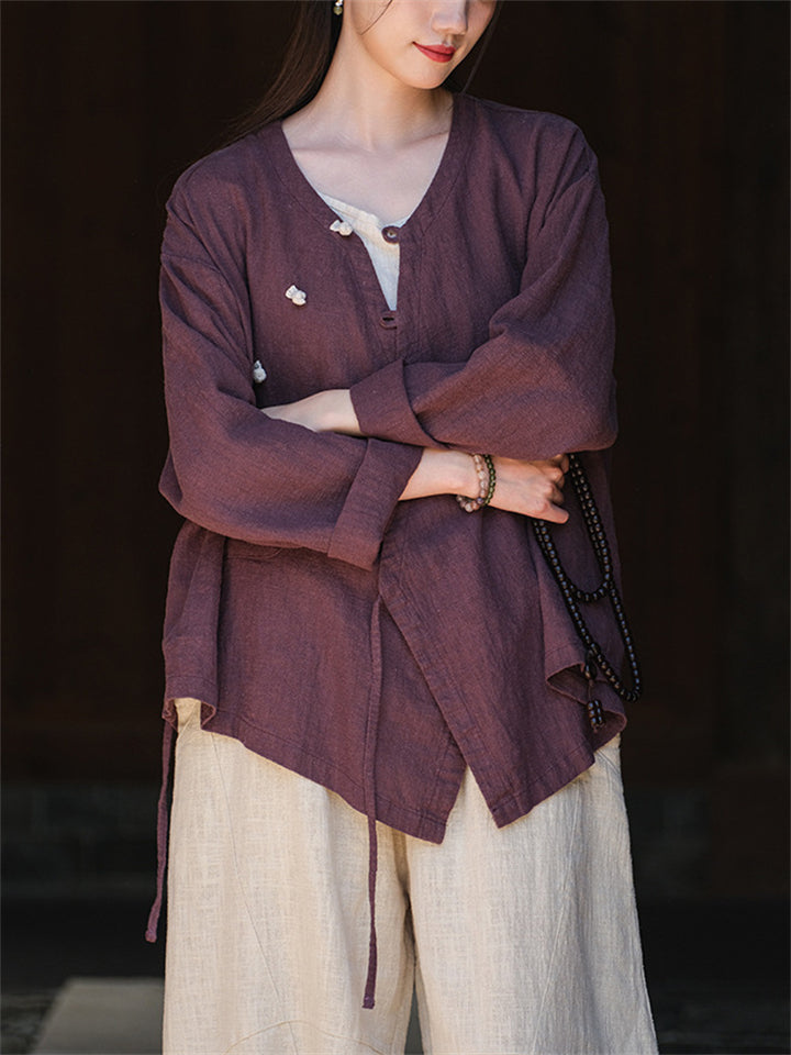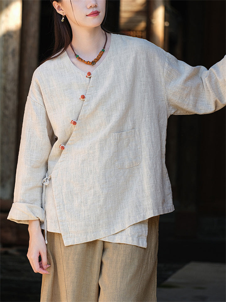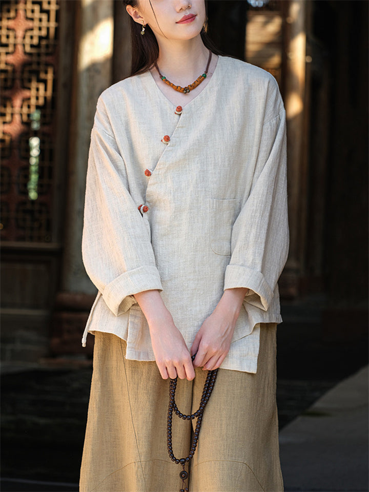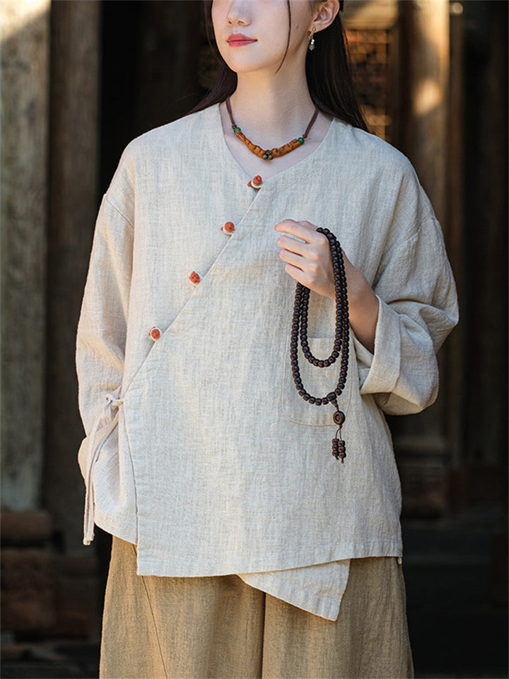 Ancient Chinese Style Floral Embroidery Linen Shirt for Women