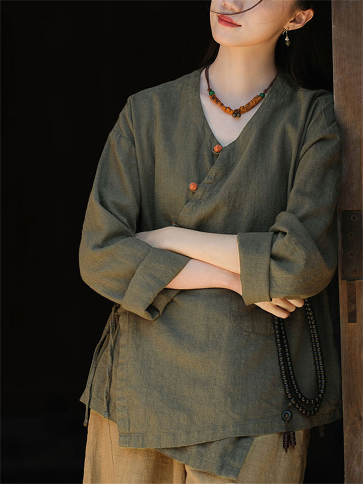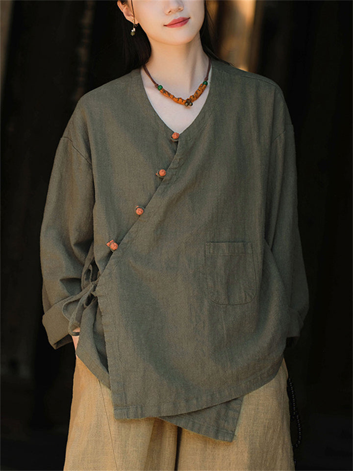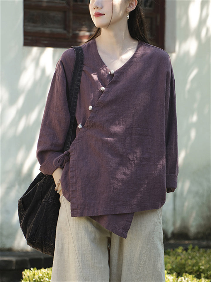 Spring V Neck Long Sleeve Soft Linen Shirt for Women