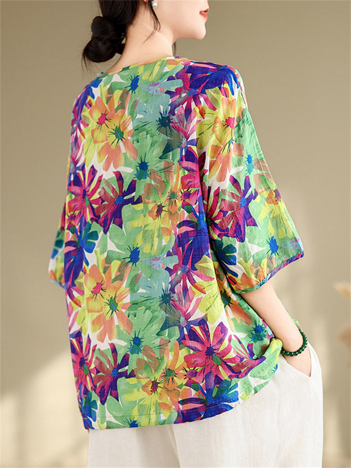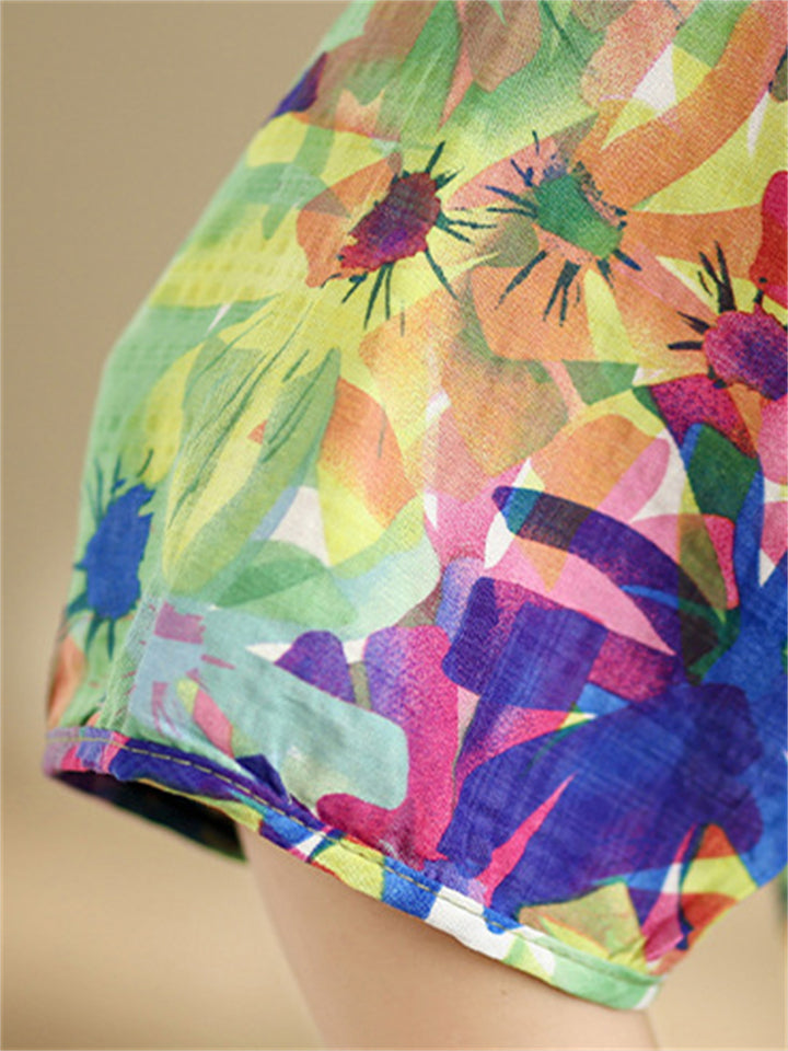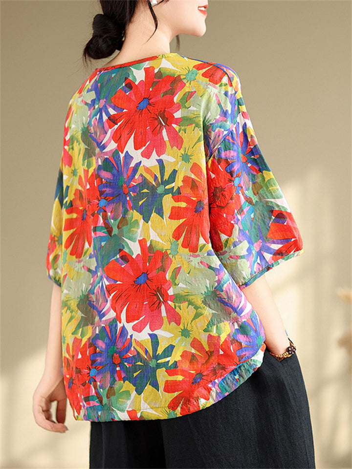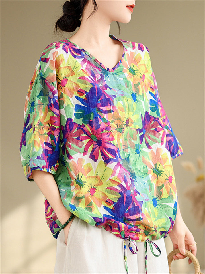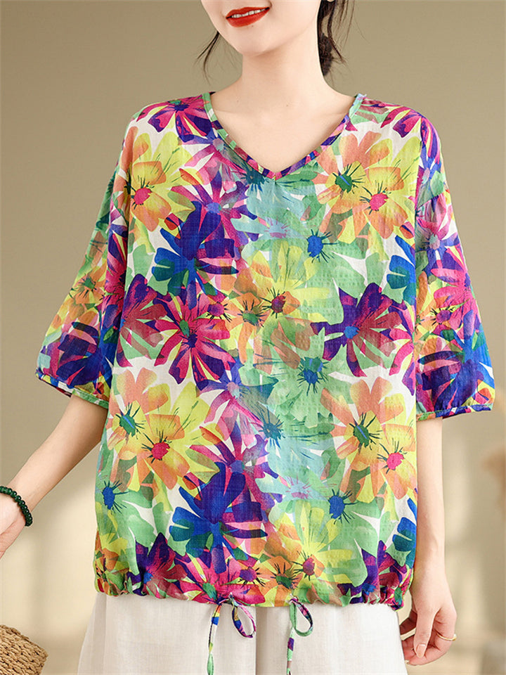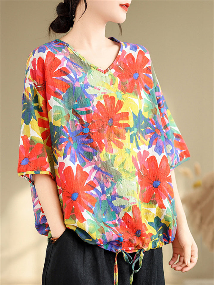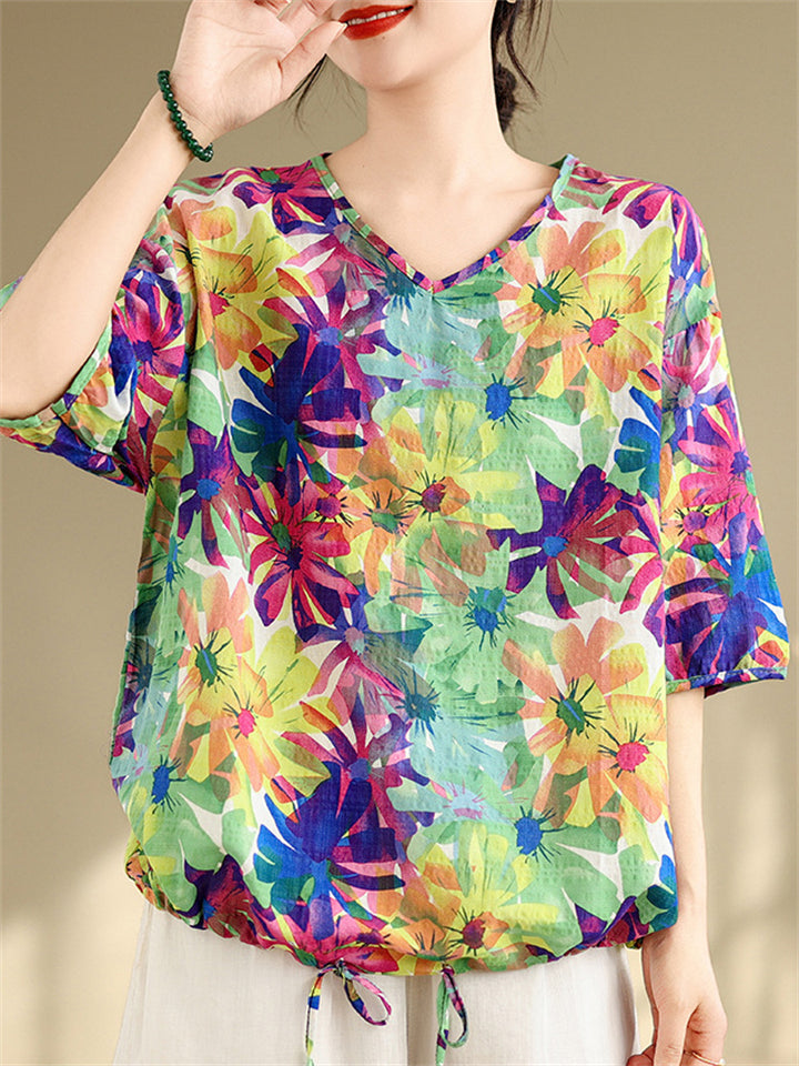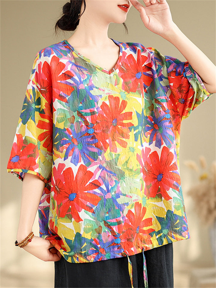 Summer Bohemian Style V Neck Print Vacation Shirt for Women