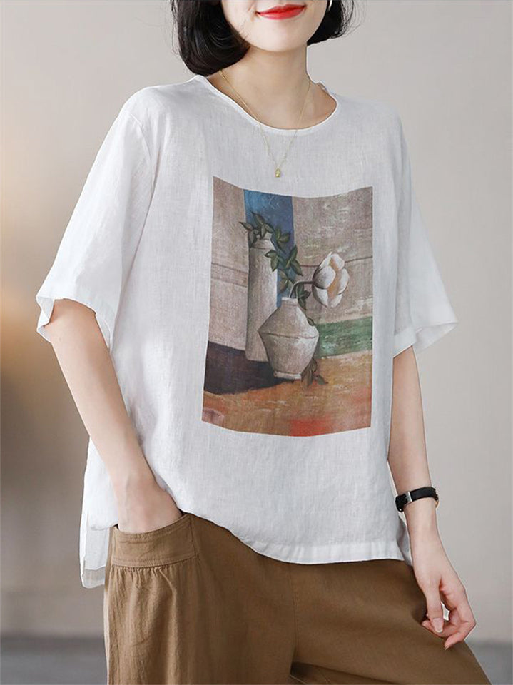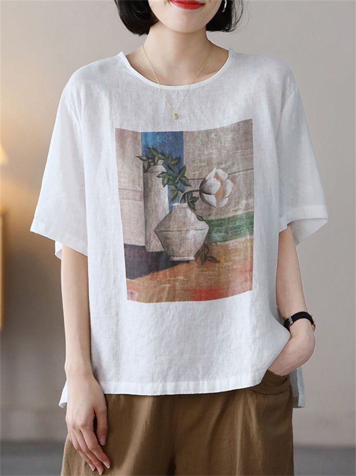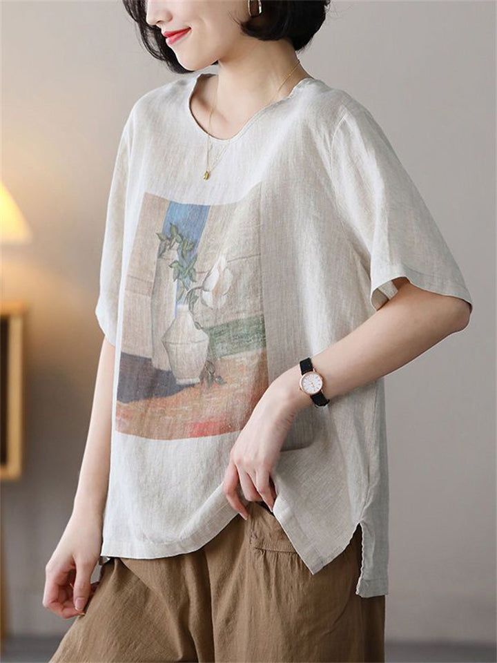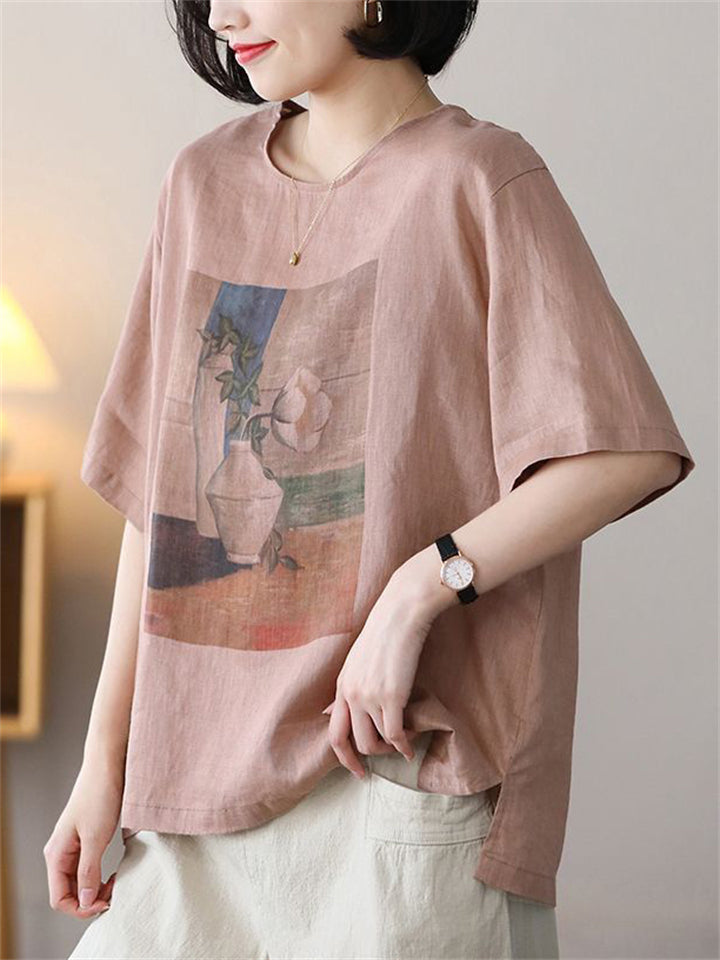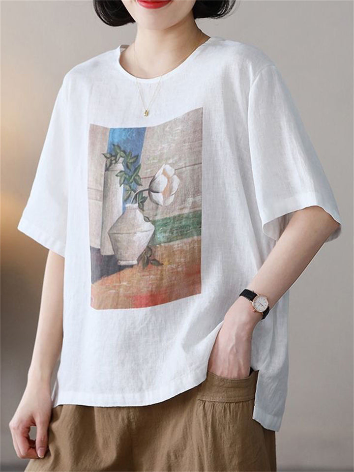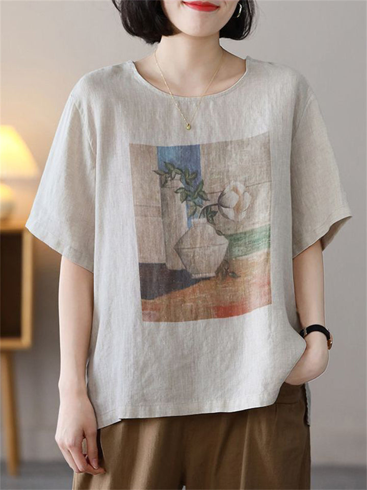 Summer Casual Cotton Linen Painting Print Round Neck T-shirt for Women