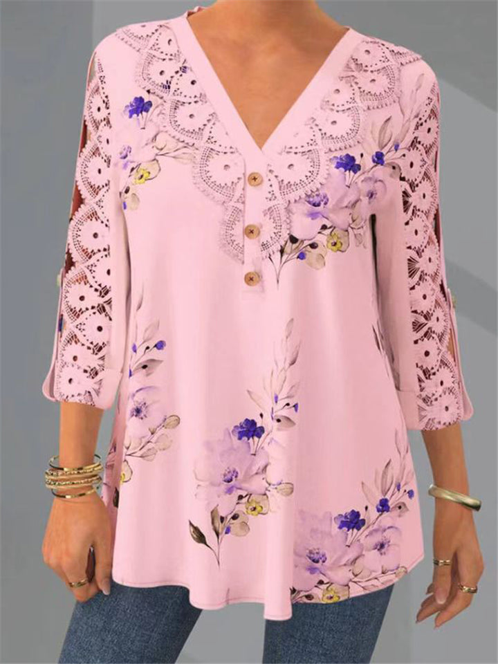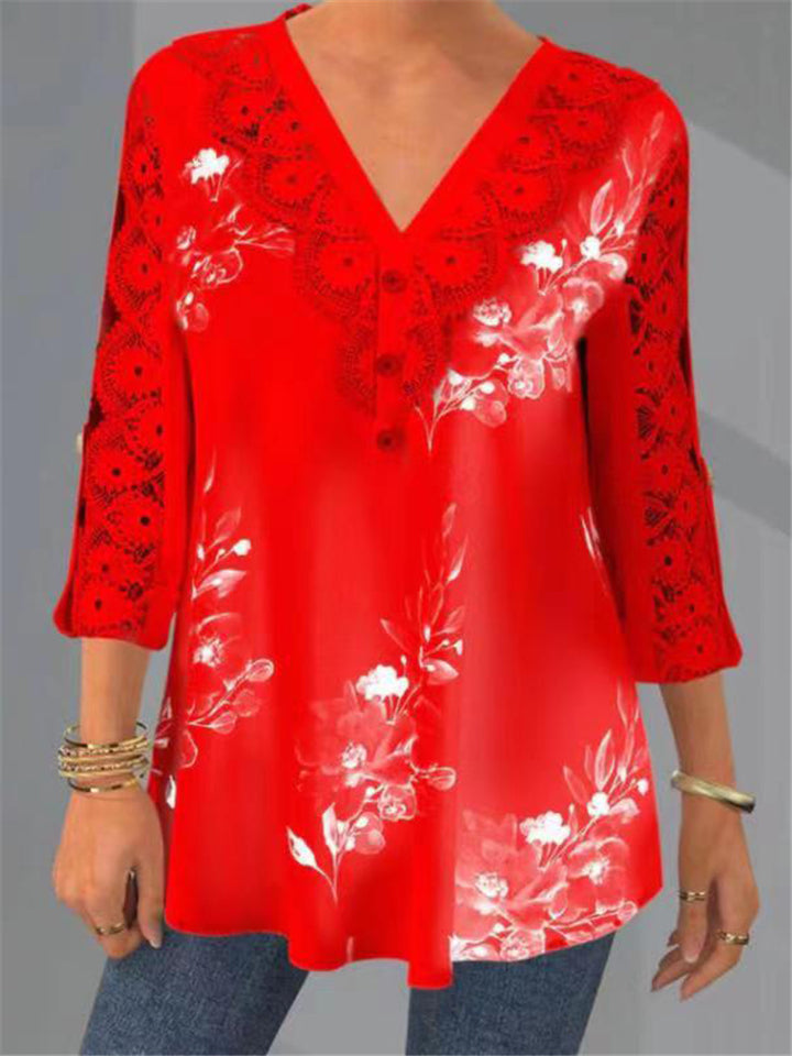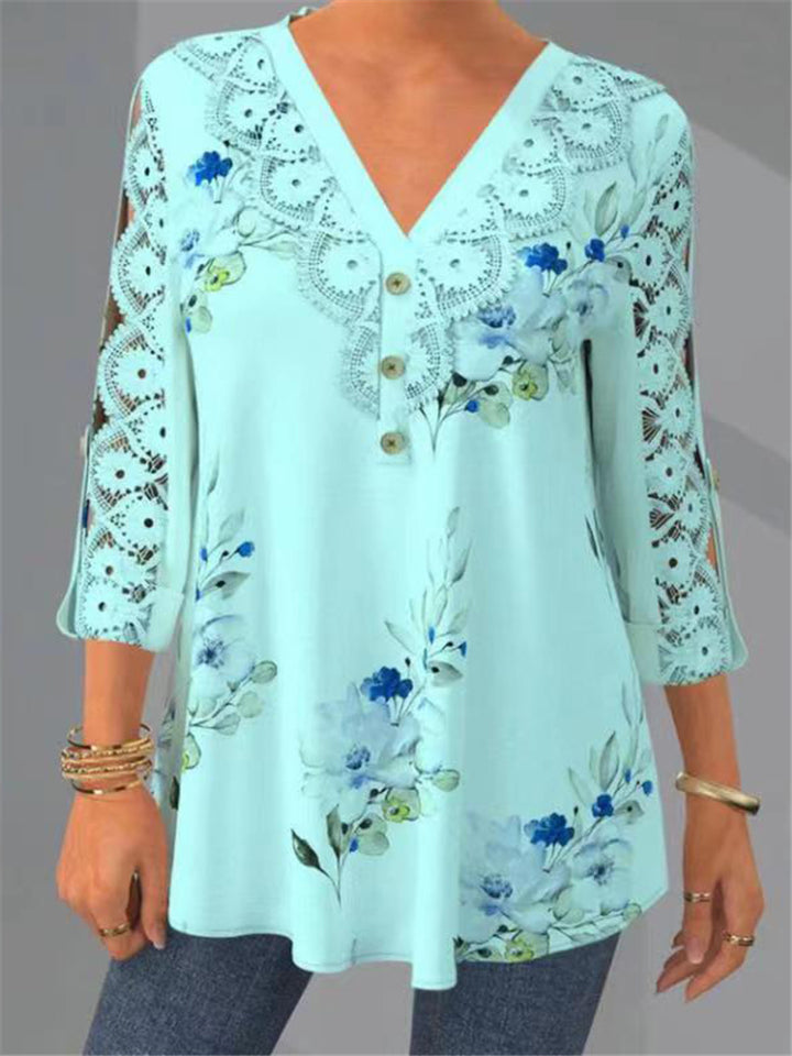 V-Neck Floral Printed Lace 3/4 Sleeve Blouses