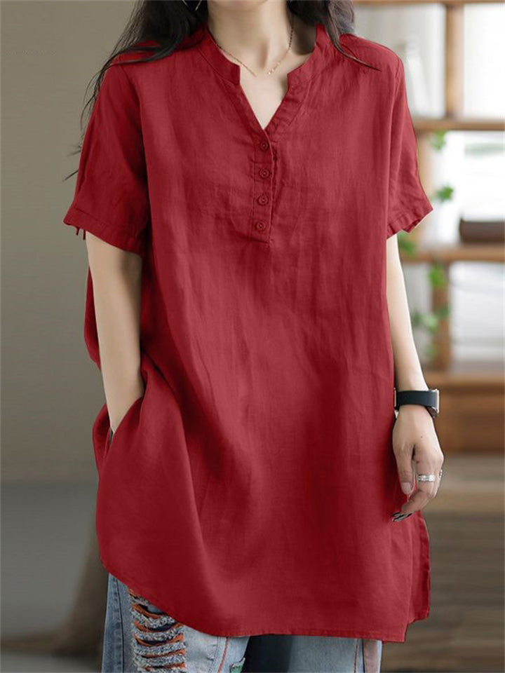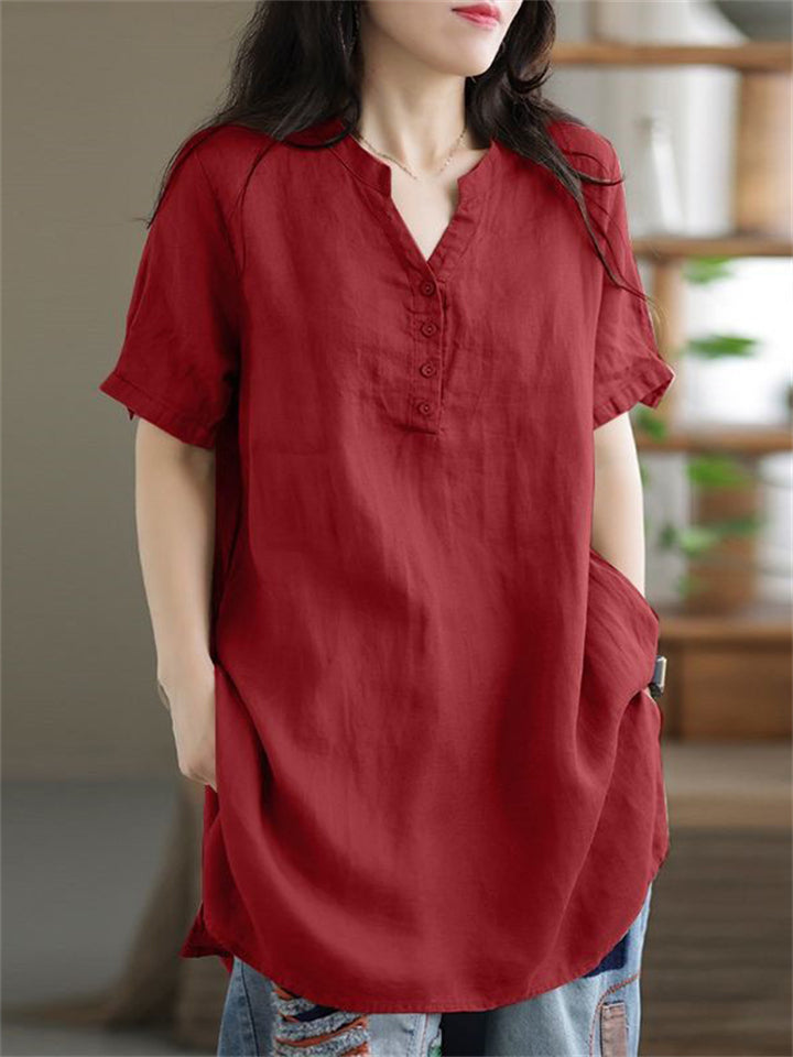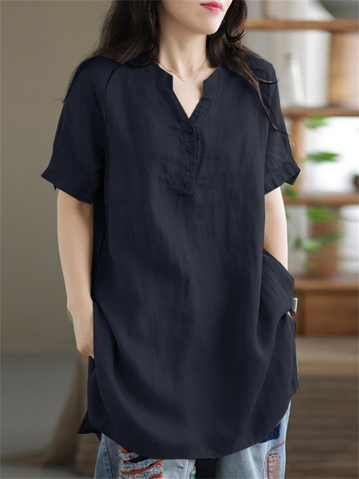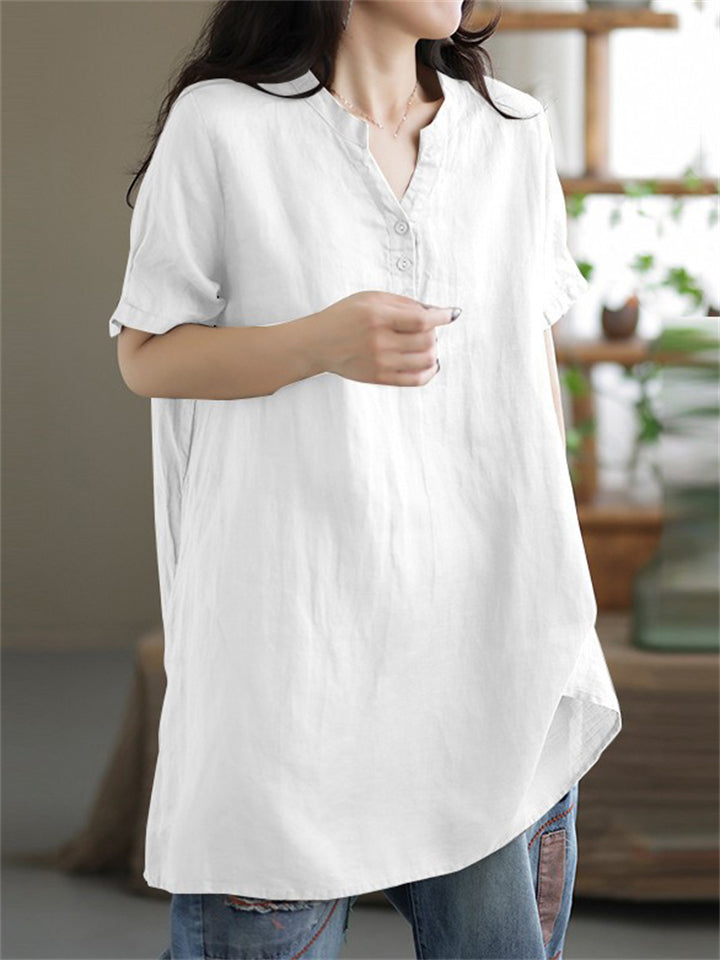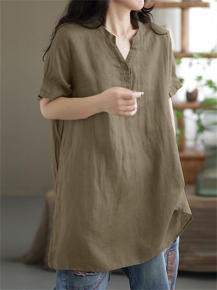 V Neck Short Sleeve Pullover Relaxed Linen Shirt for Female
