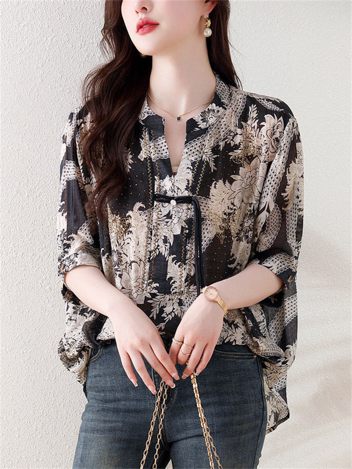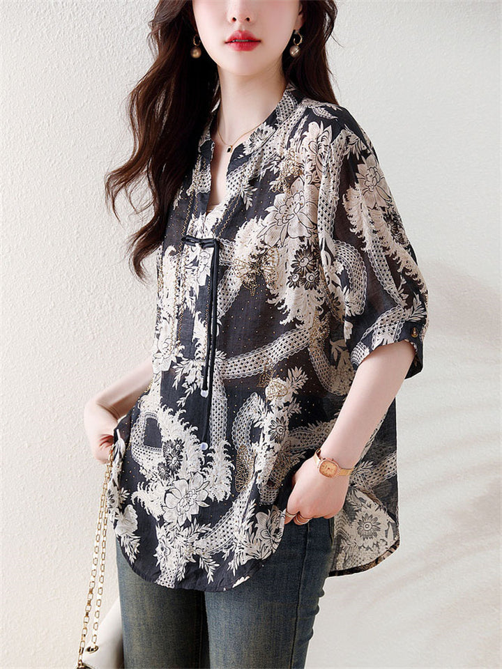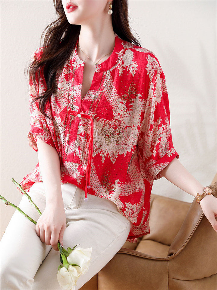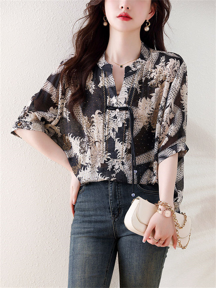 Lady Stand-up Collar Floral Printed Chinese Style Shirts