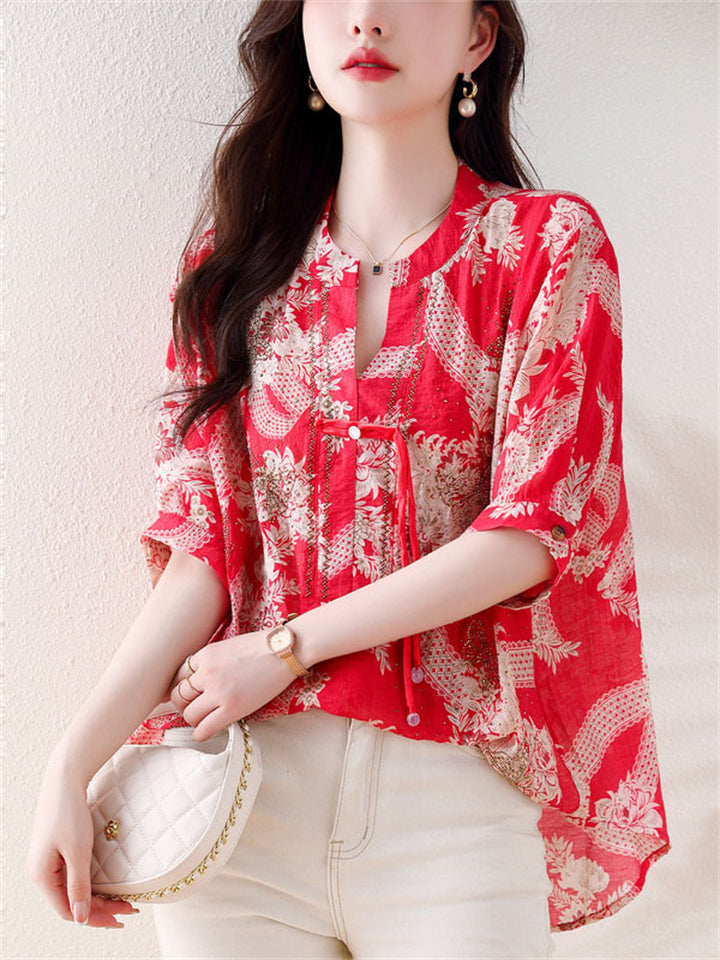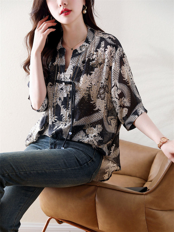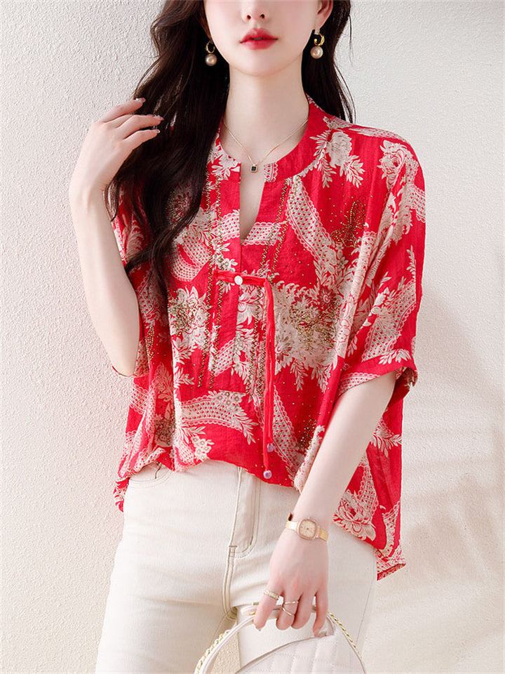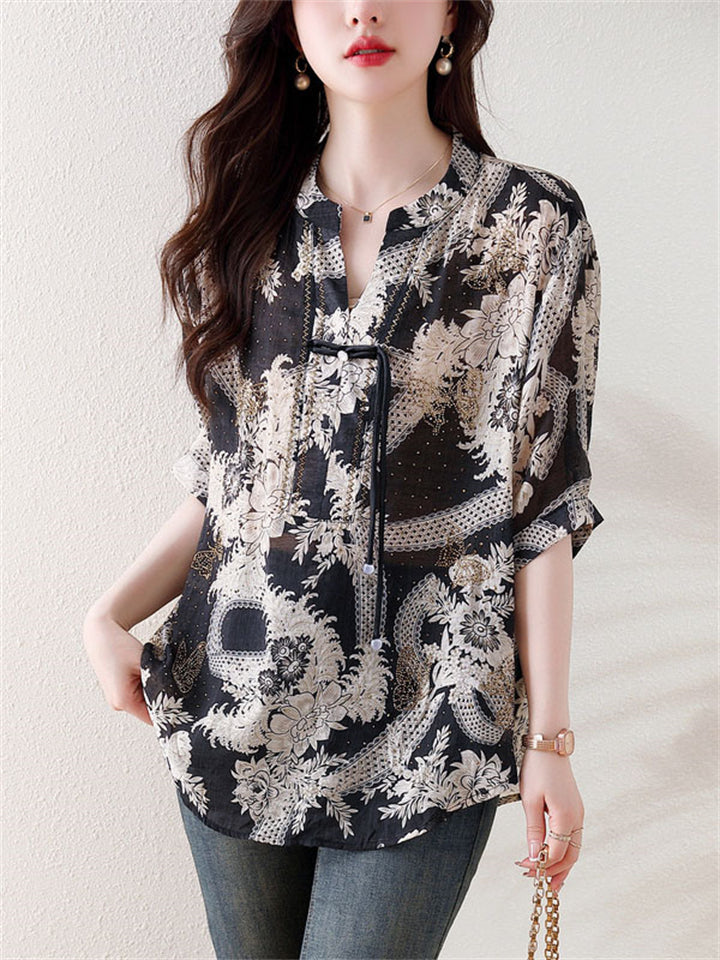 Summer Bohemian Style V Neck Print Vacation Shirt for Women