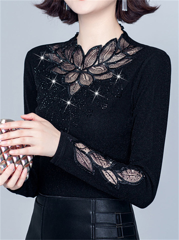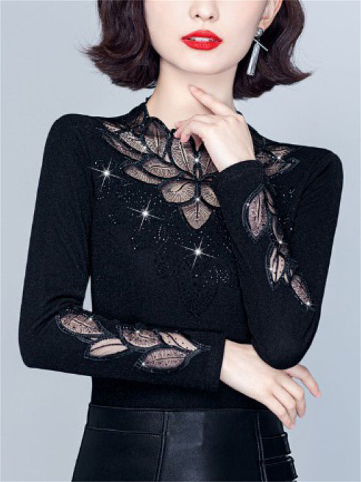 Women's Elegant Autumn Cotton Striped Hollow Stand Collar Long Sleeve Shirts