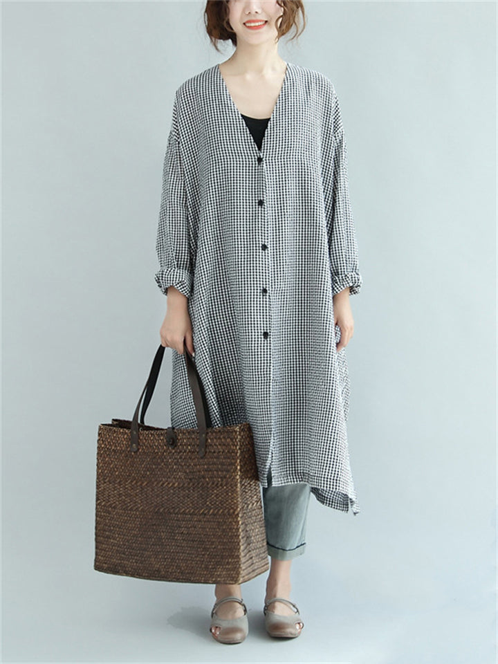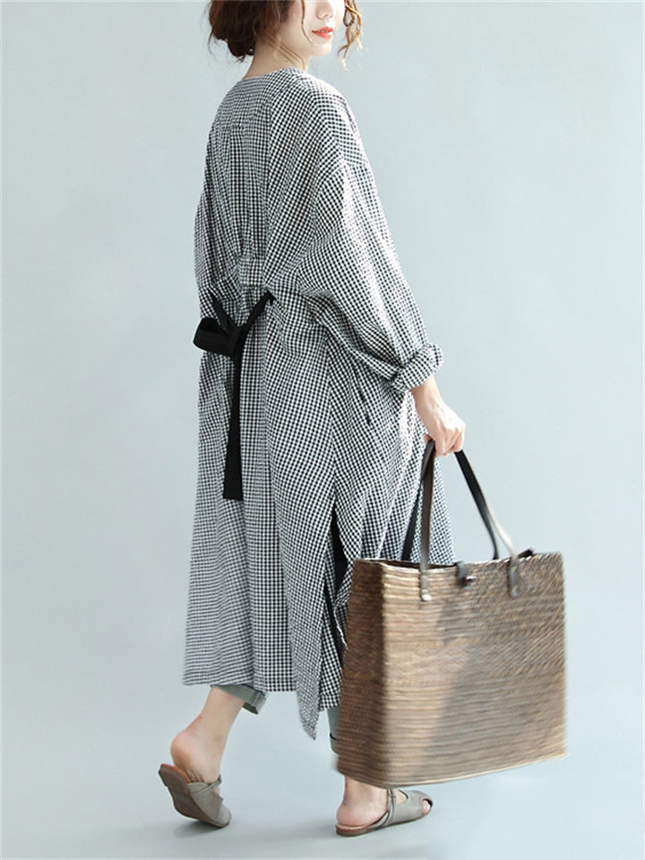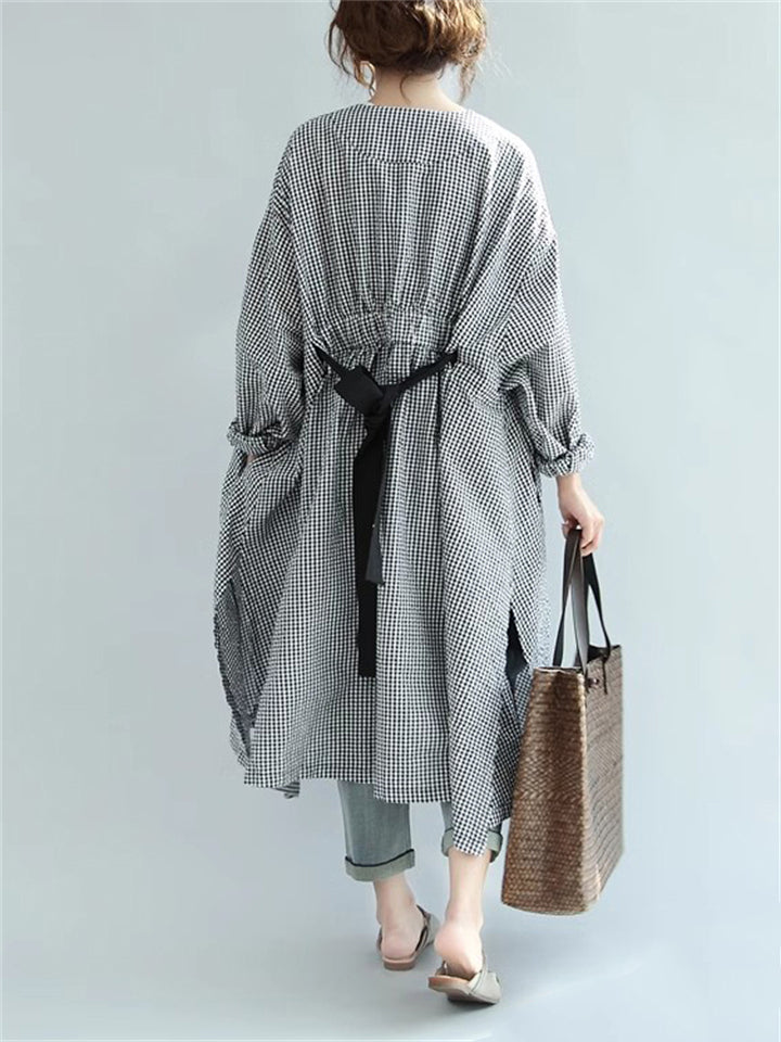 Women's Black White Plaid Mid-Length Lace-Up V-Neck Shirt