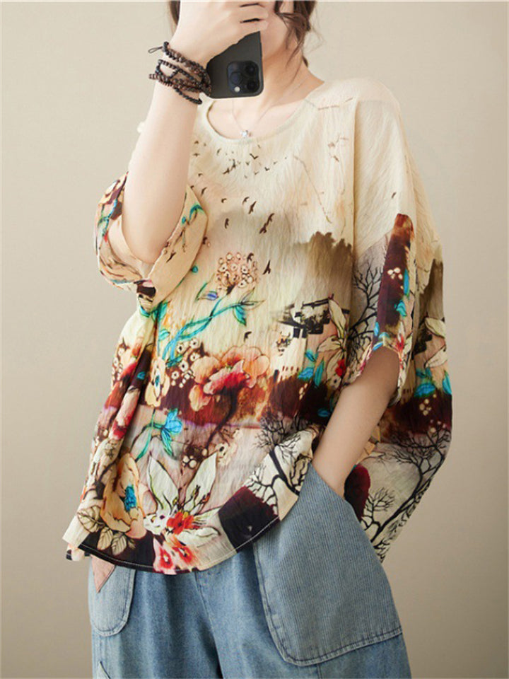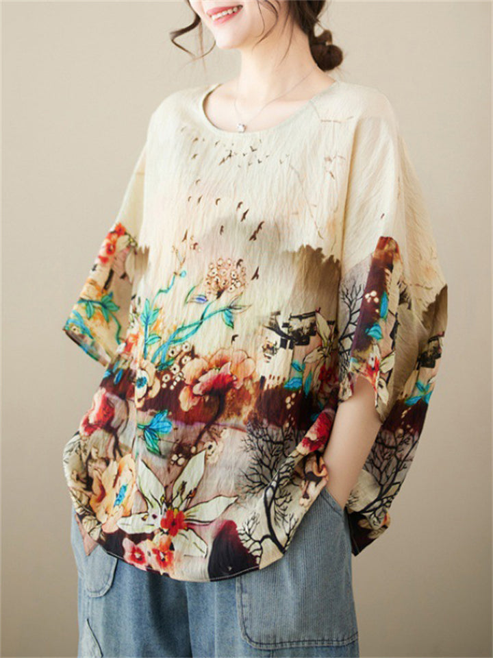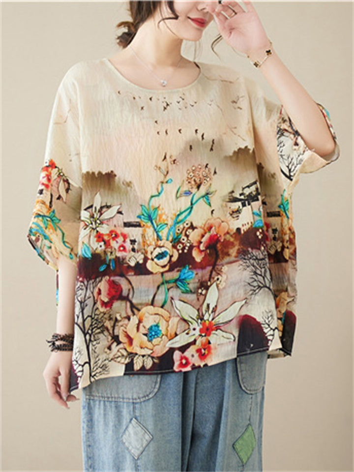 Women's Casual Round Neck Half Sleeve Oversized Print Shirt