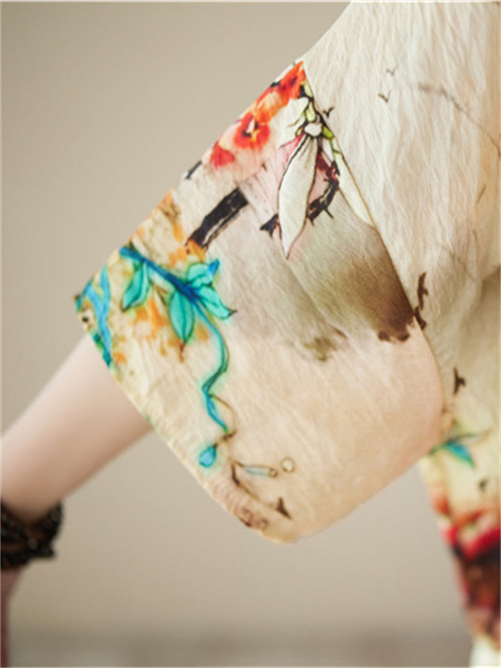 Lady Stand-up Collar Floral Printed Chinese Style Shirts