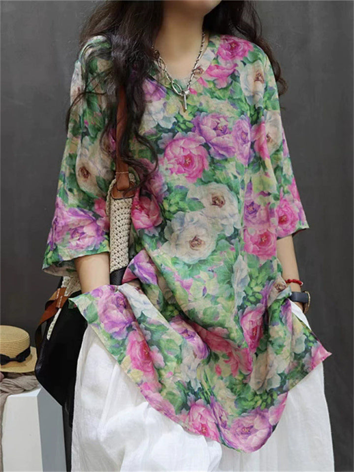 Summer Bohemian Style V Neck Print Vacation Shirt for Women