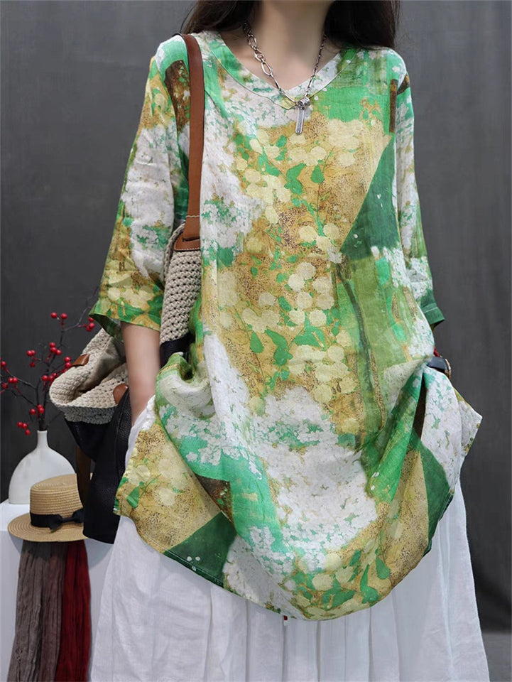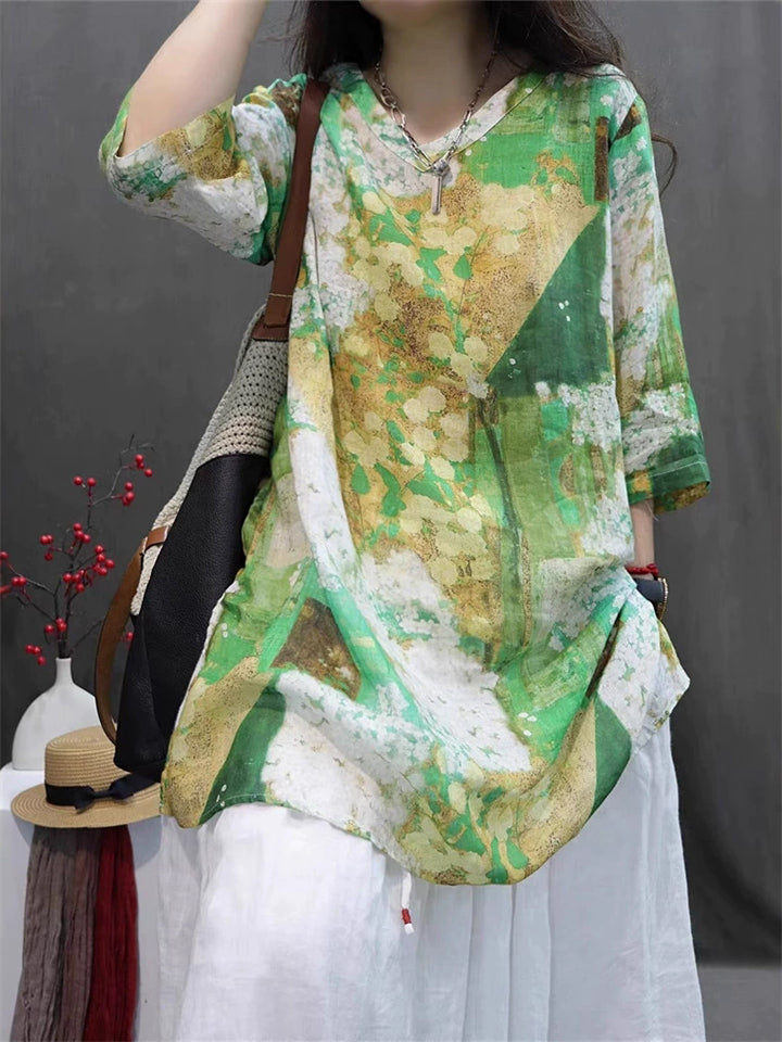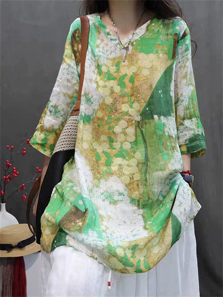 Summer Bohemian Style V Neck Print Vacation Shirt for Women
