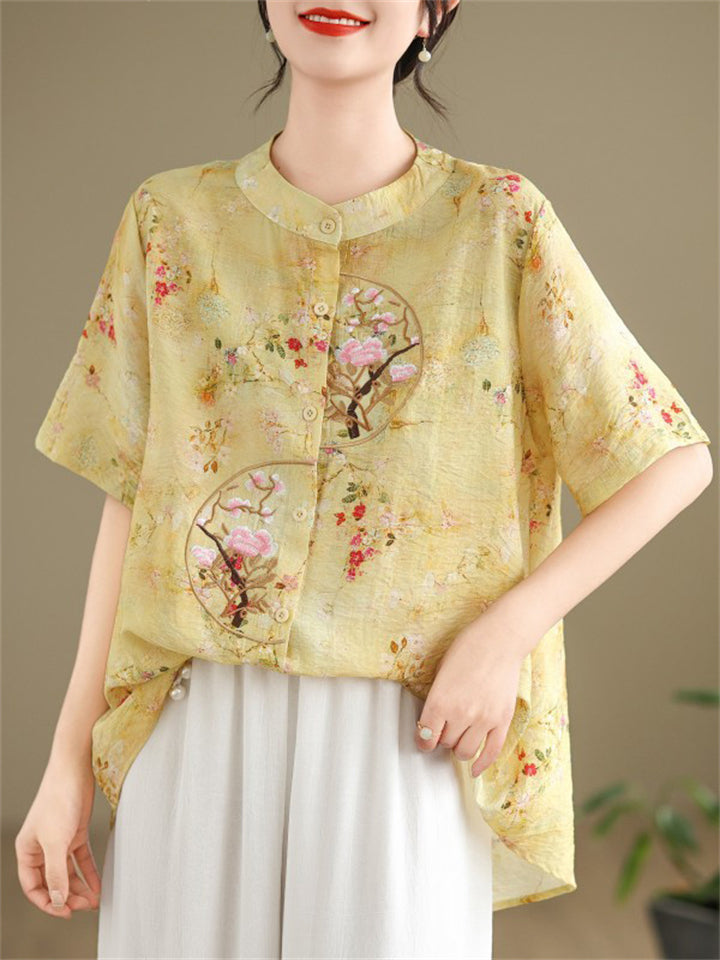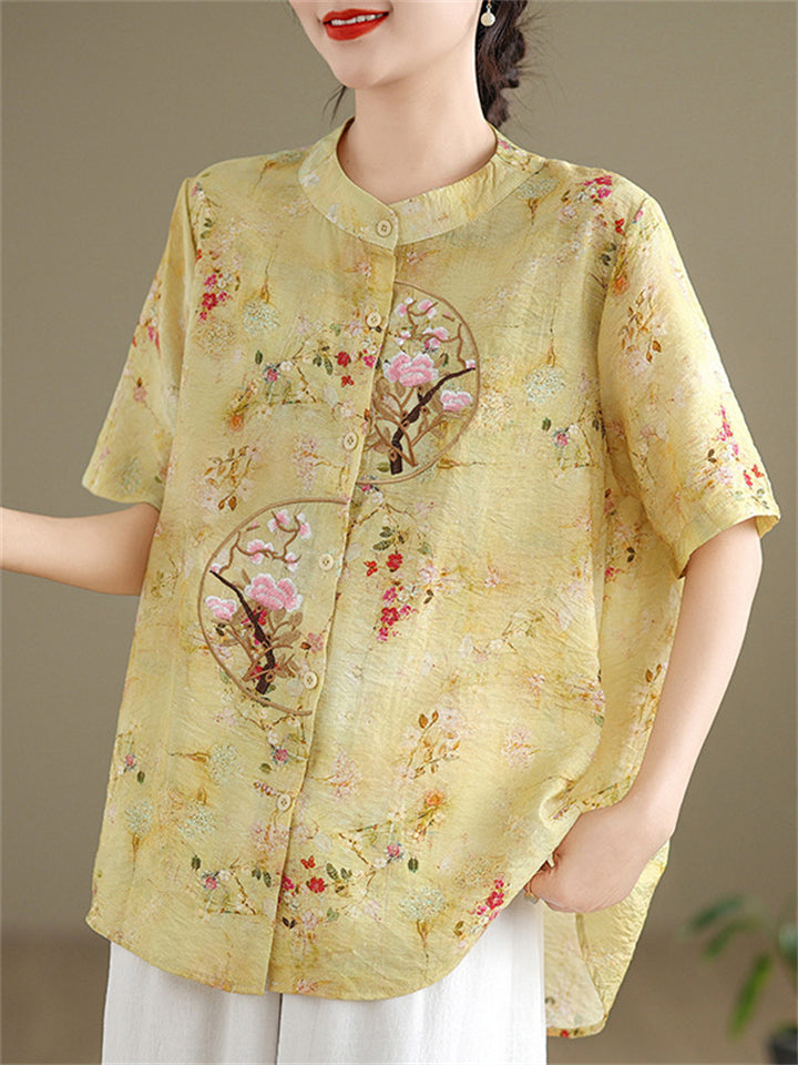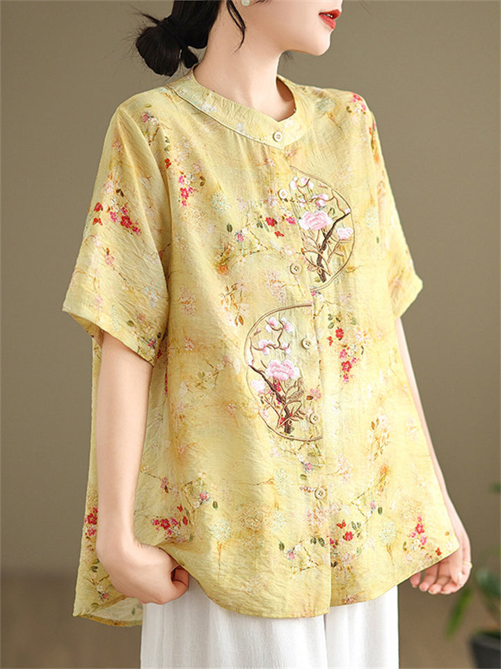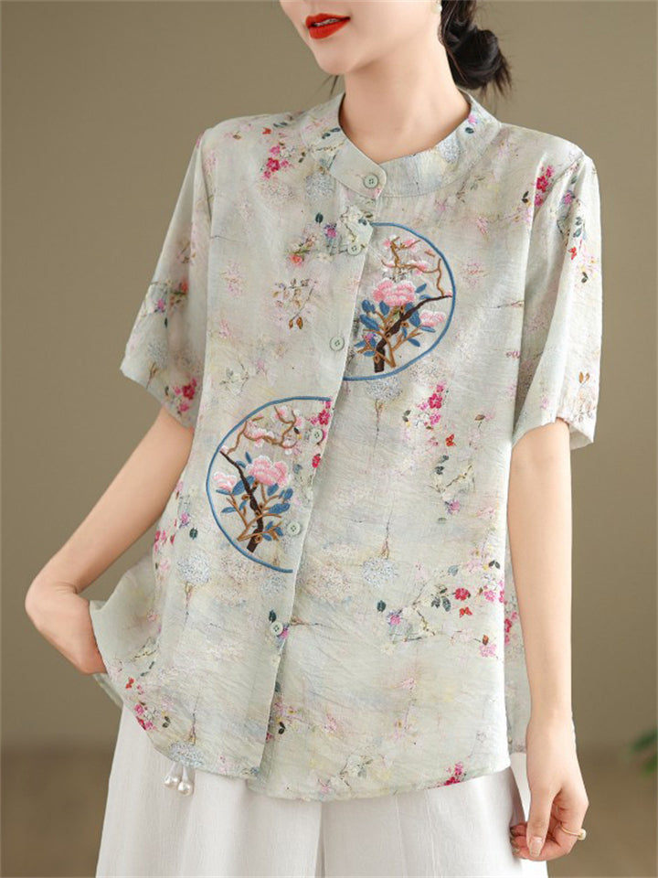 Women's Chinese Style Embroidery Summer Stand Collar Shirt