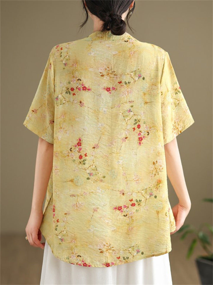 Lady Stand-up Collar Floral Printed Chinese Style Shirts