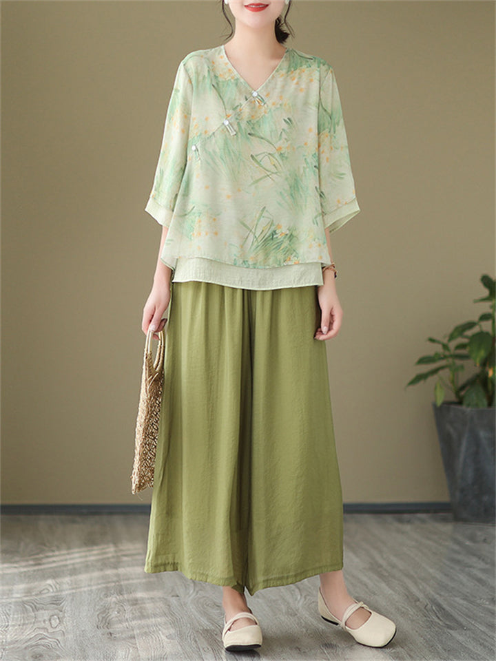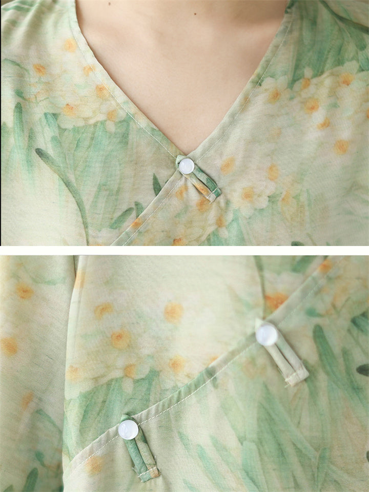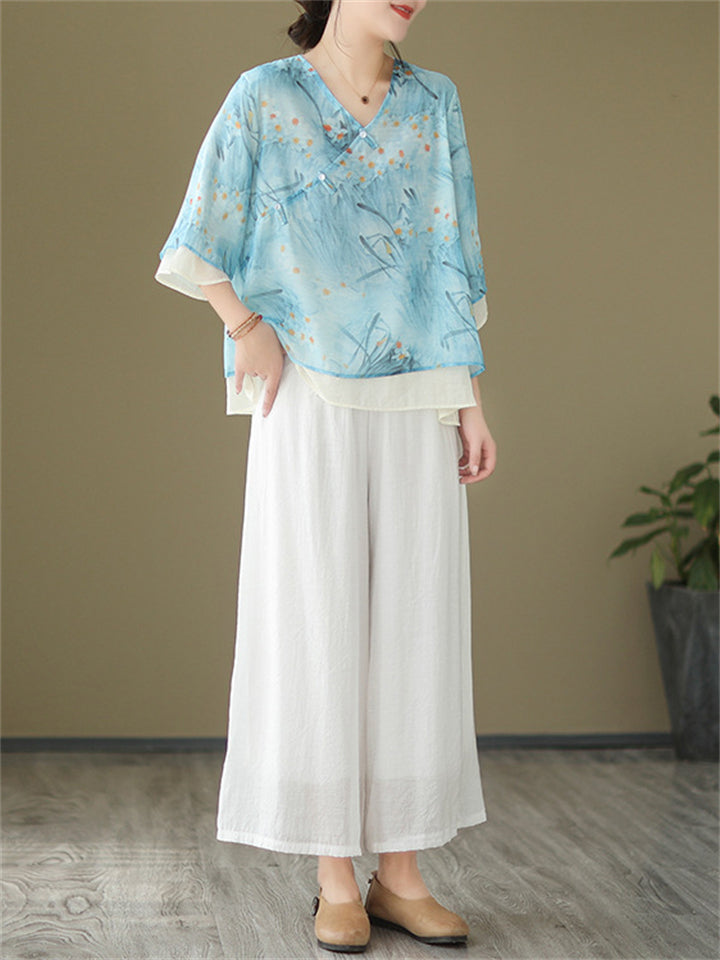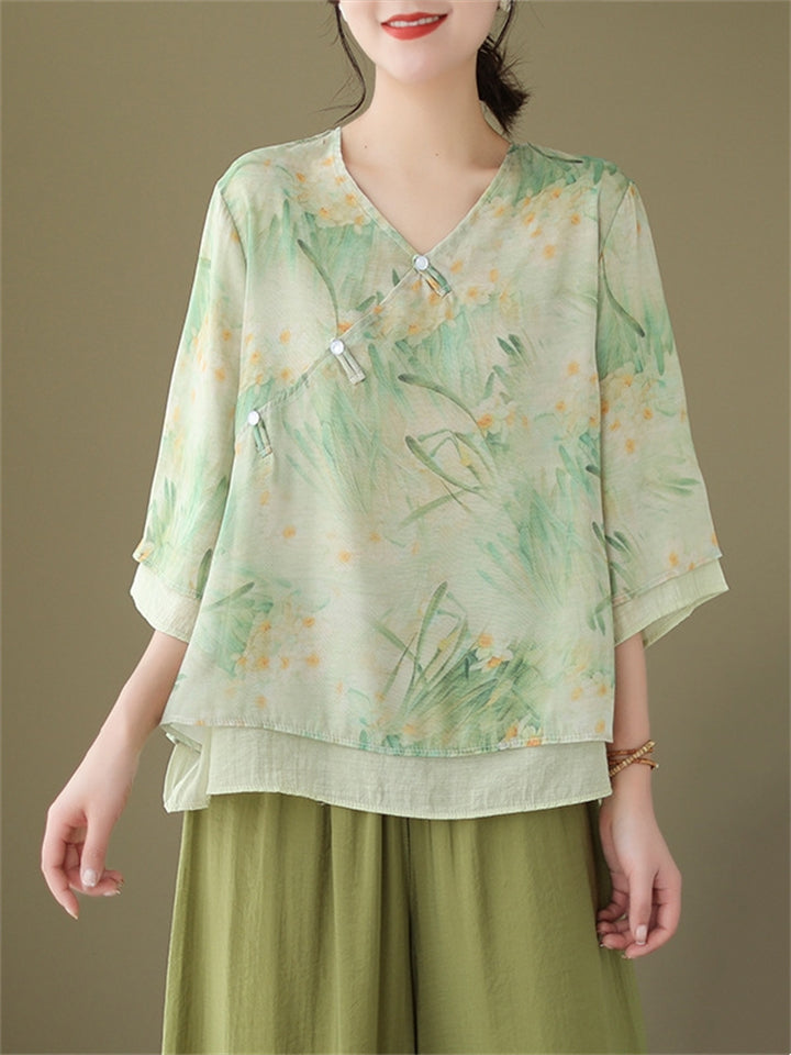Women's Chinese Style V-Neck Double-Layer Floral Shirts