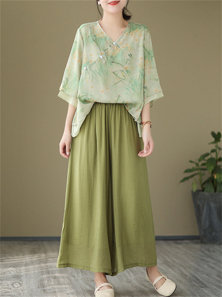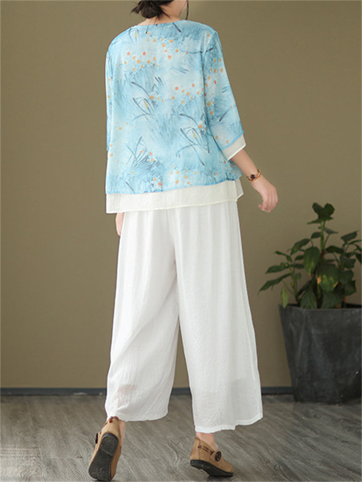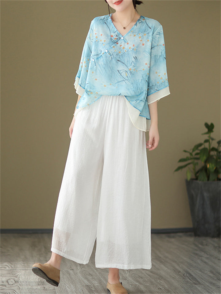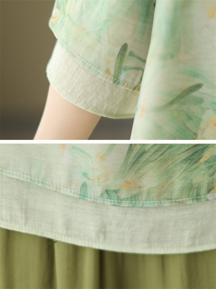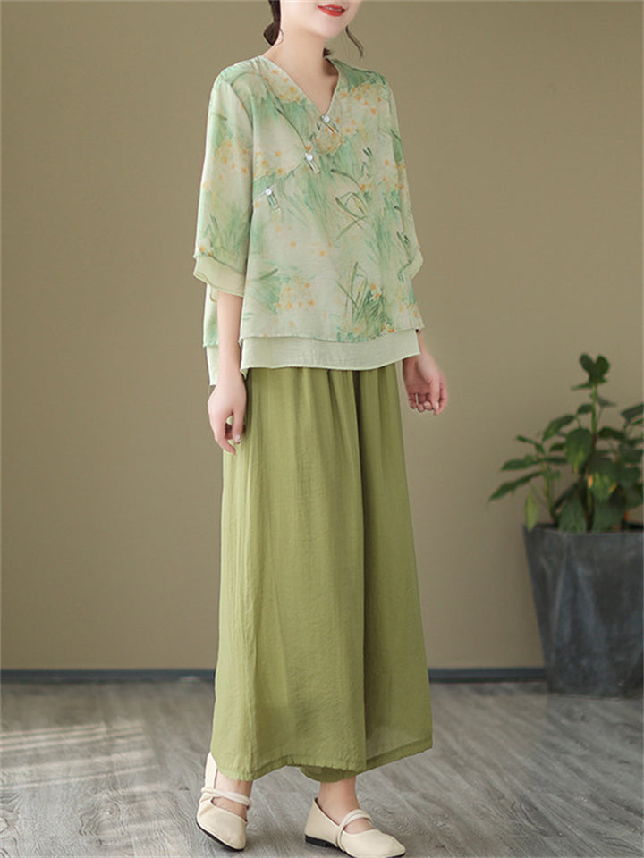Women's Chinese Style V-Neck Double-Layer Floral Shirts