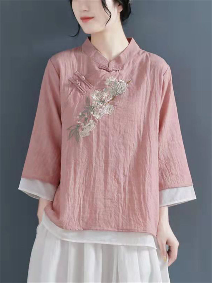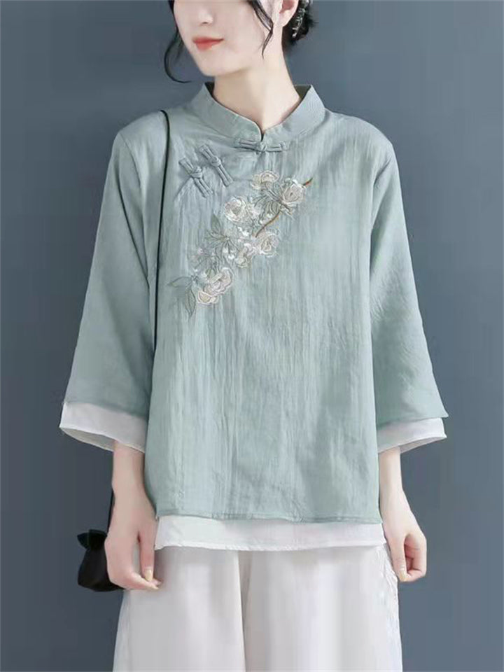 Ancient Chinese Style Floral Embroidery Linen Shirt for Women