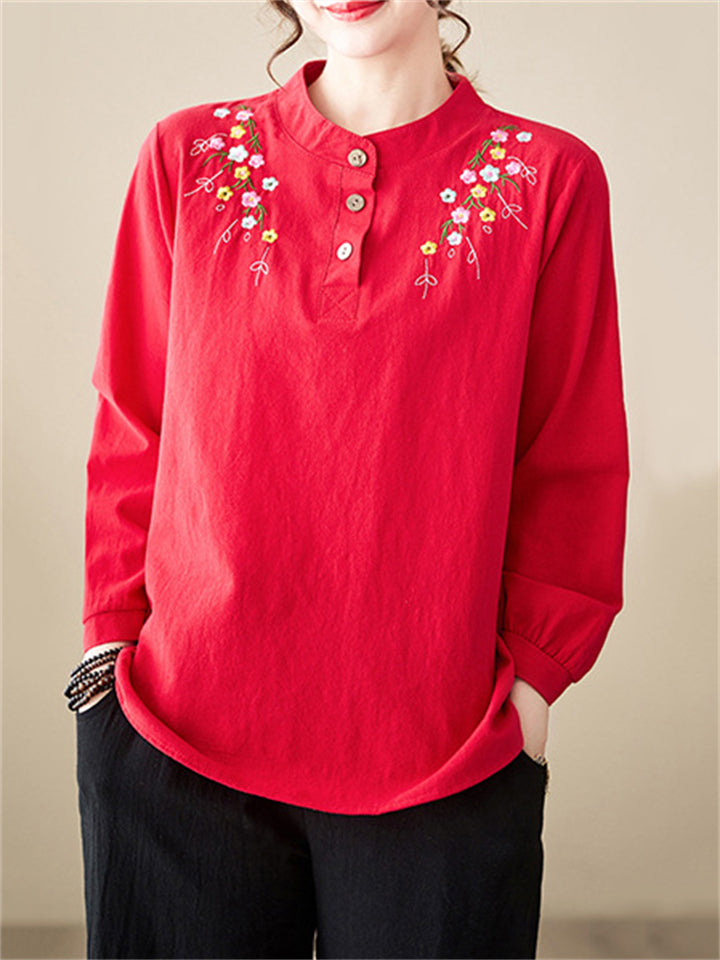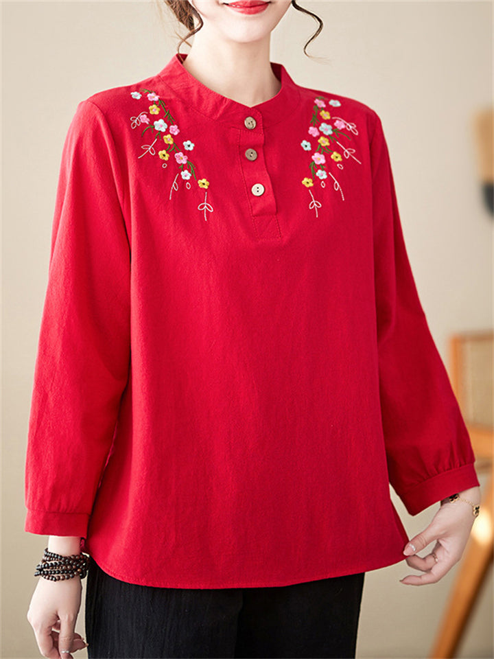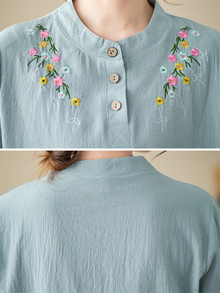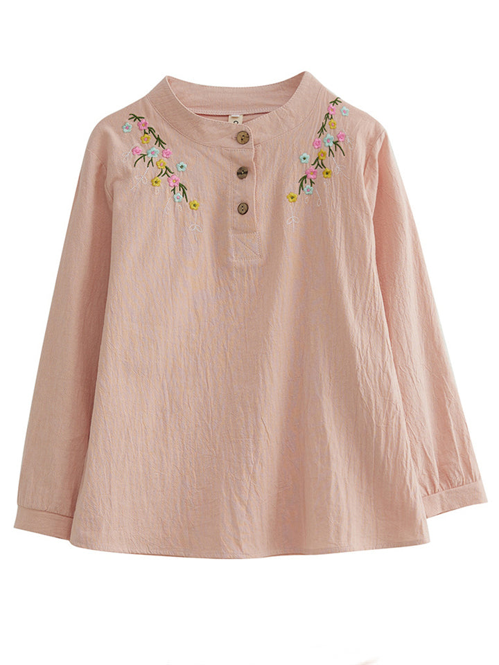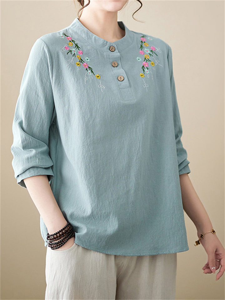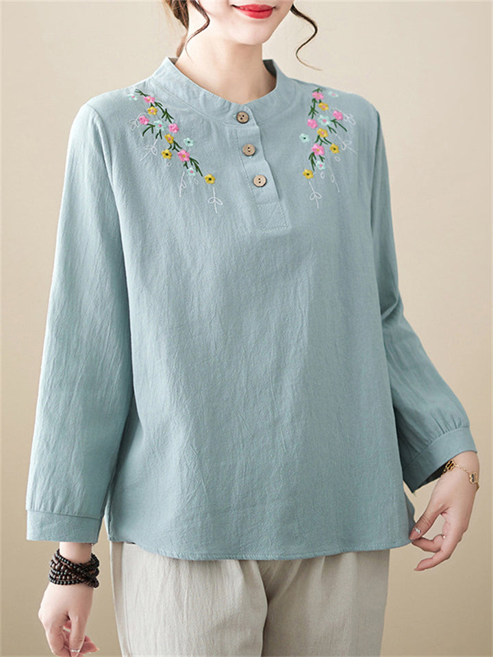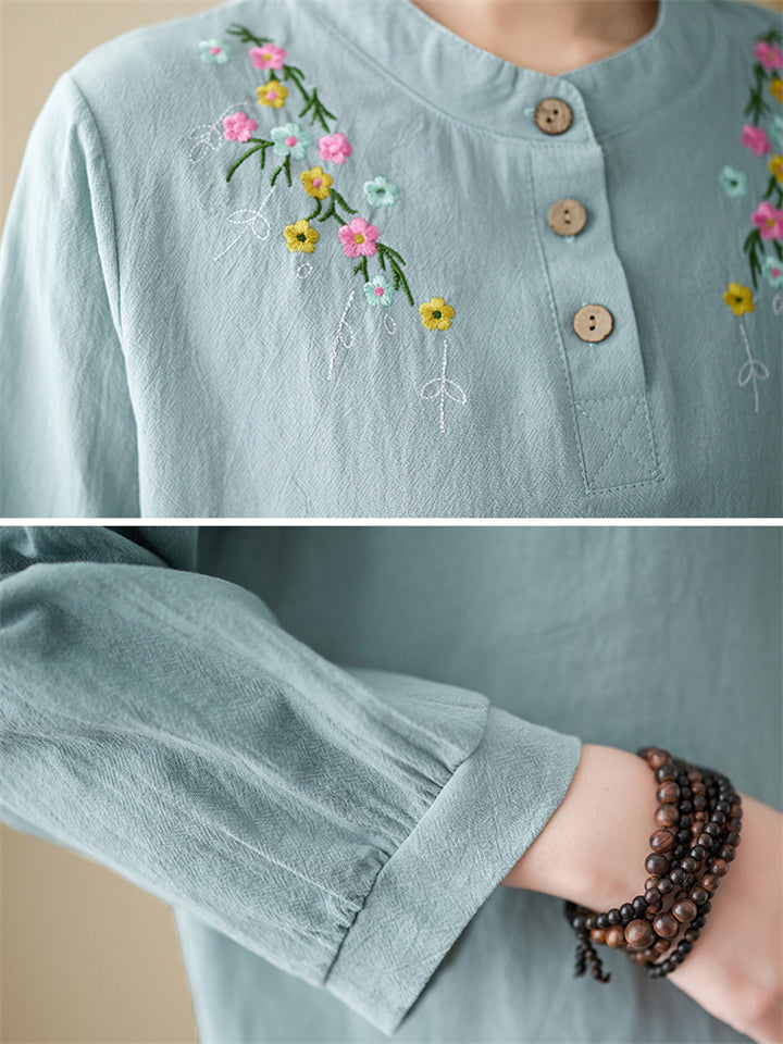 Women's Cute Flowers Embroidery Cotton Linen Long Sleeve Shirt