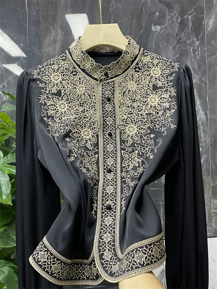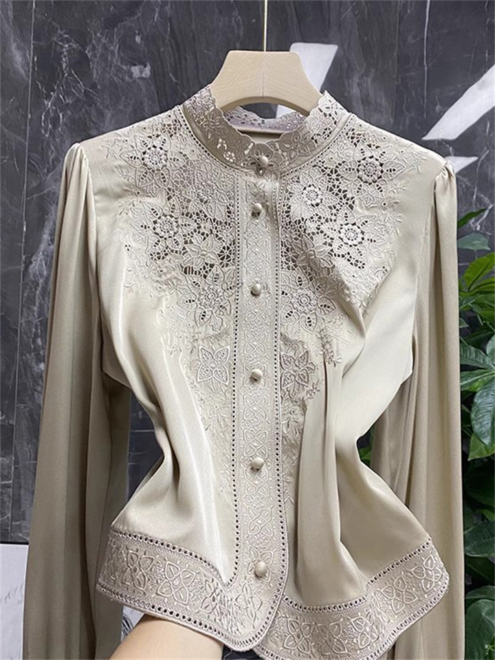 Women's Elegant Hollow Heavy Industry Embroidered Stand Collar Shirts