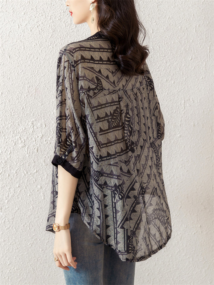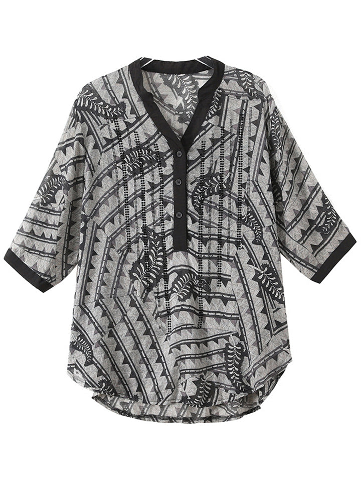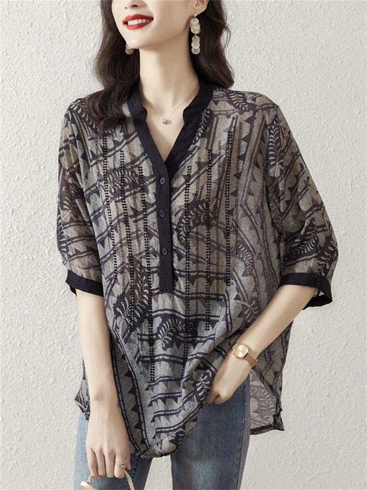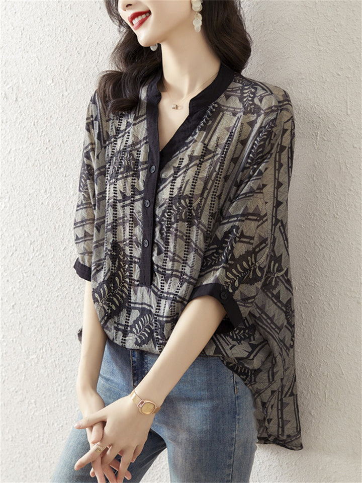 Women's Elegant V-Neck Printed Button Trim Loose Shirts