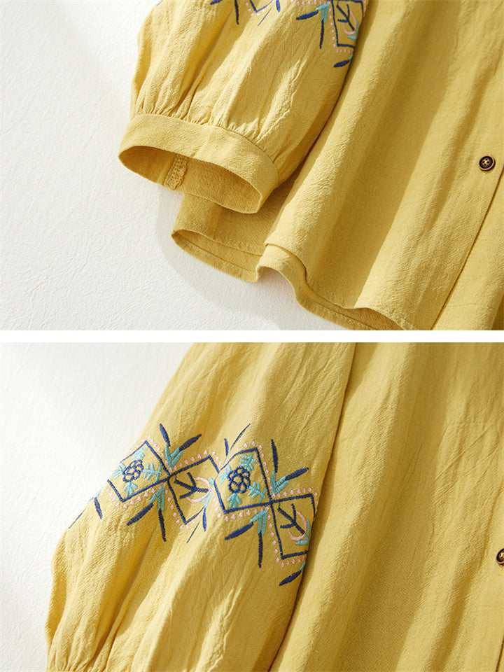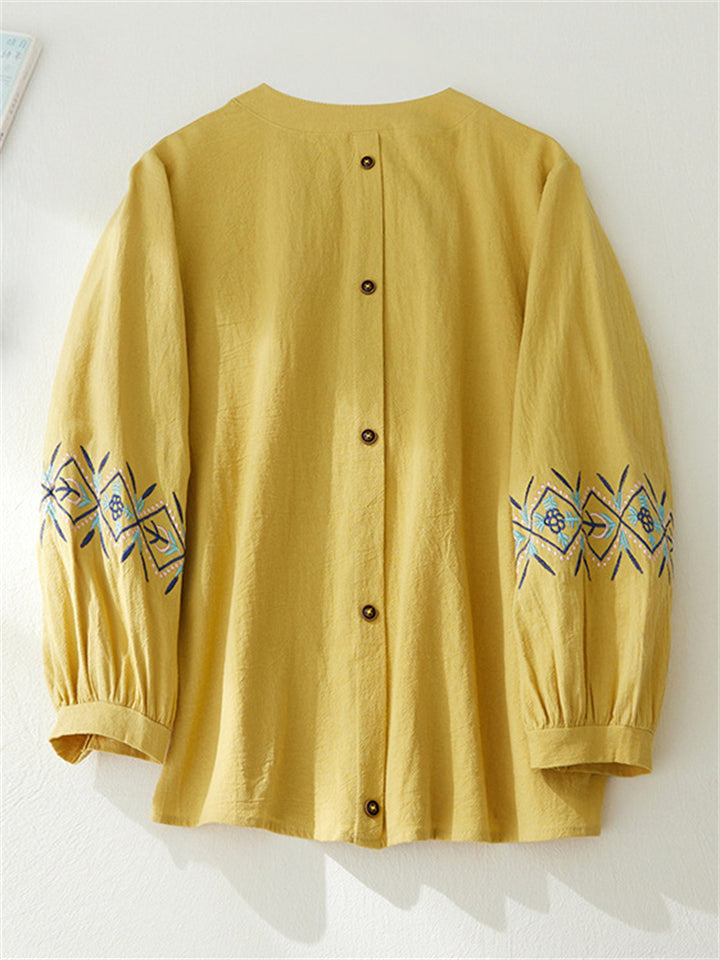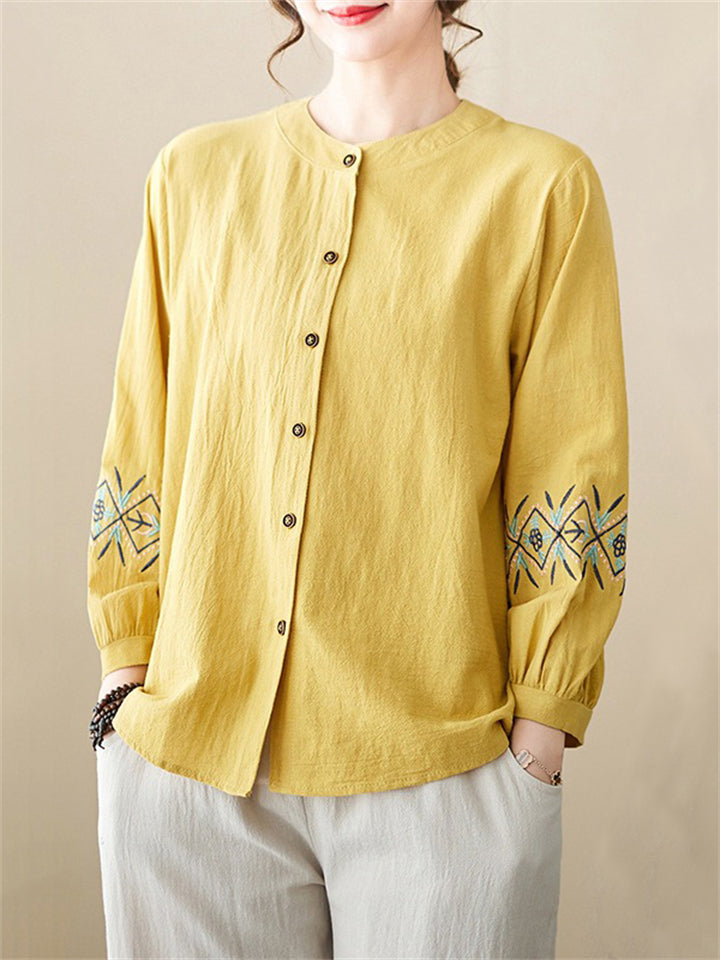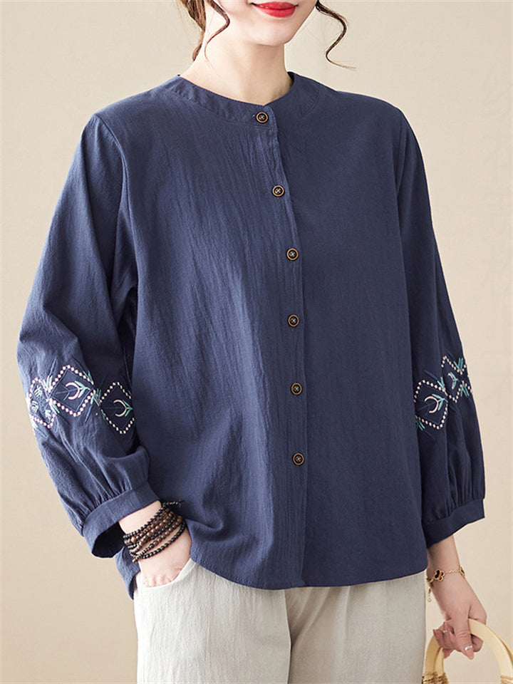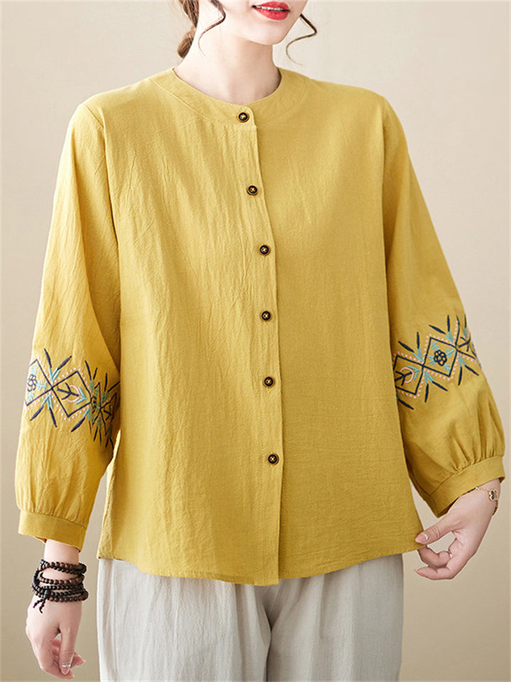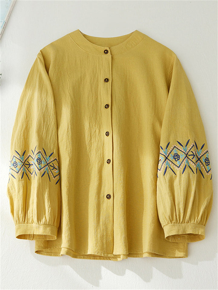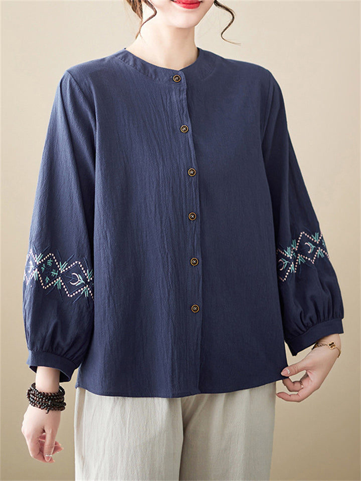 Women's Ethnic Embroideried Lantern Sleeve Stand Collor Button Linen Shirt