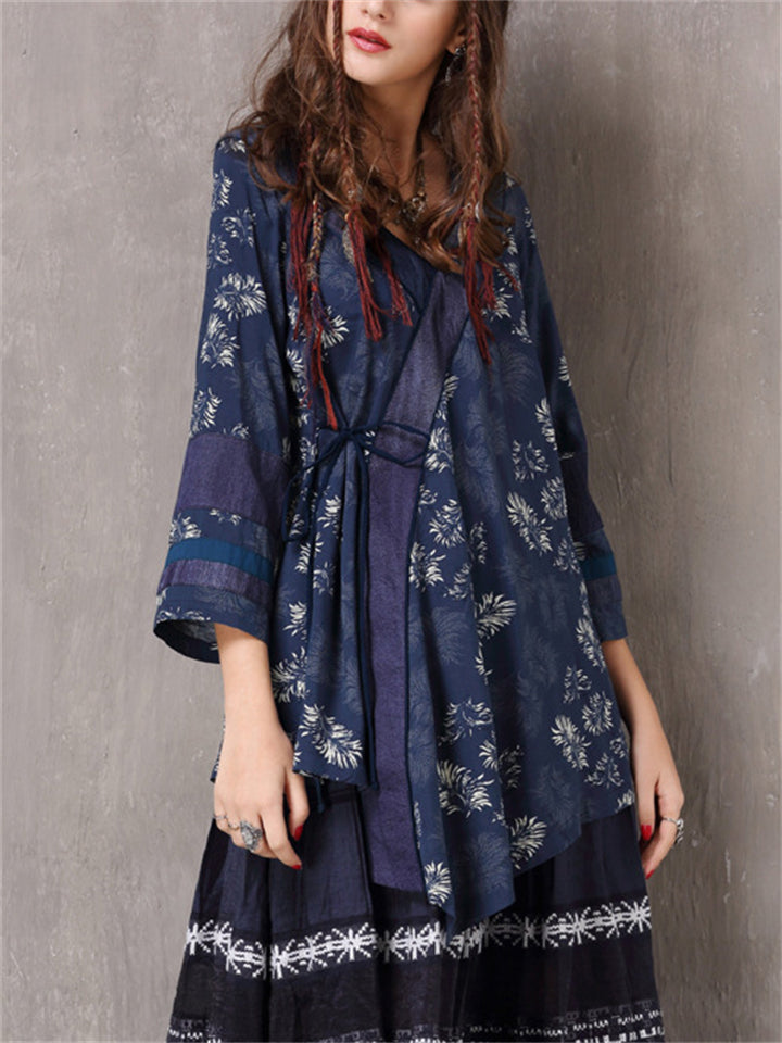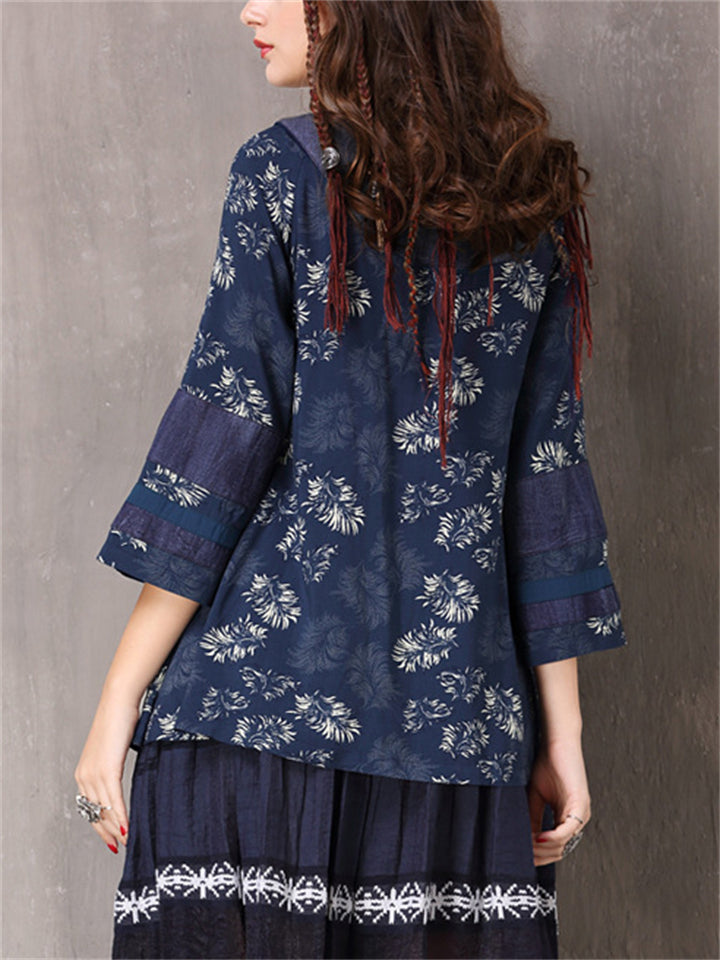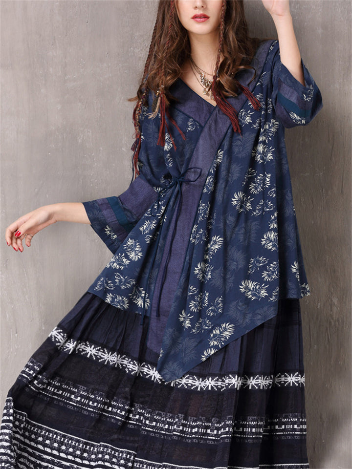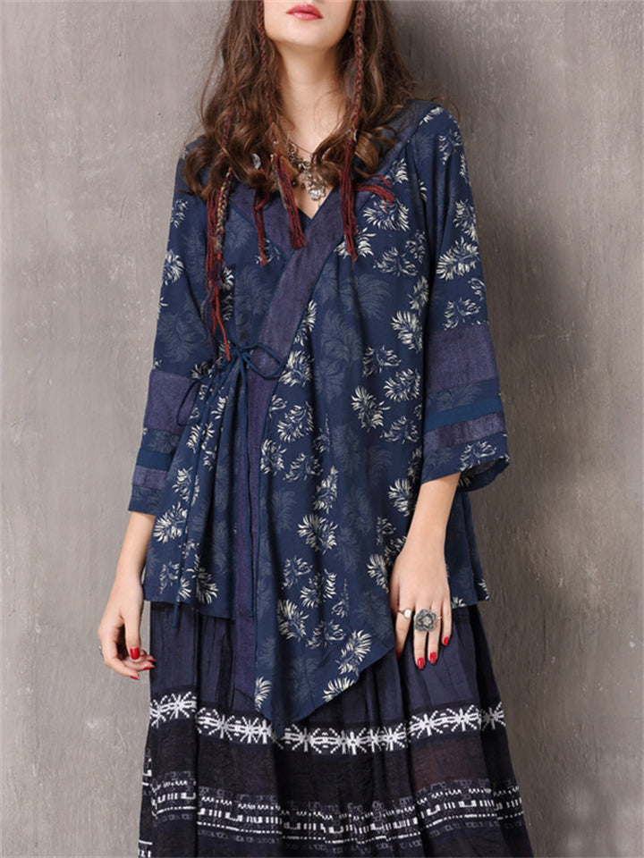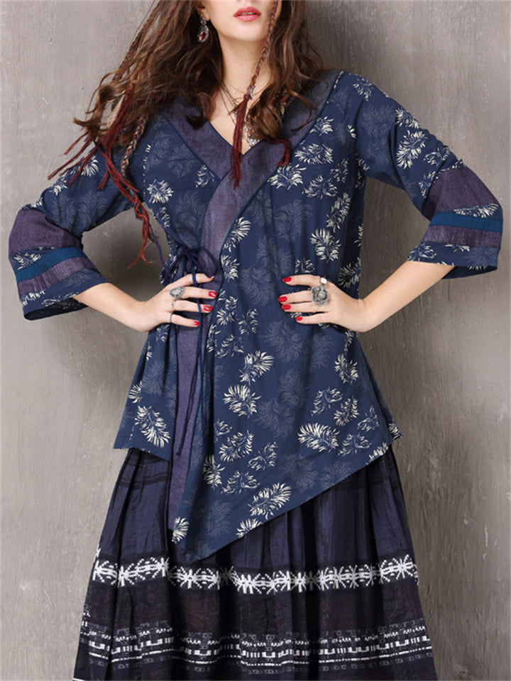 Women's Ethnic Style Irregular Hem Lace-Up Floral Shirt
