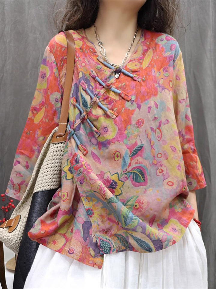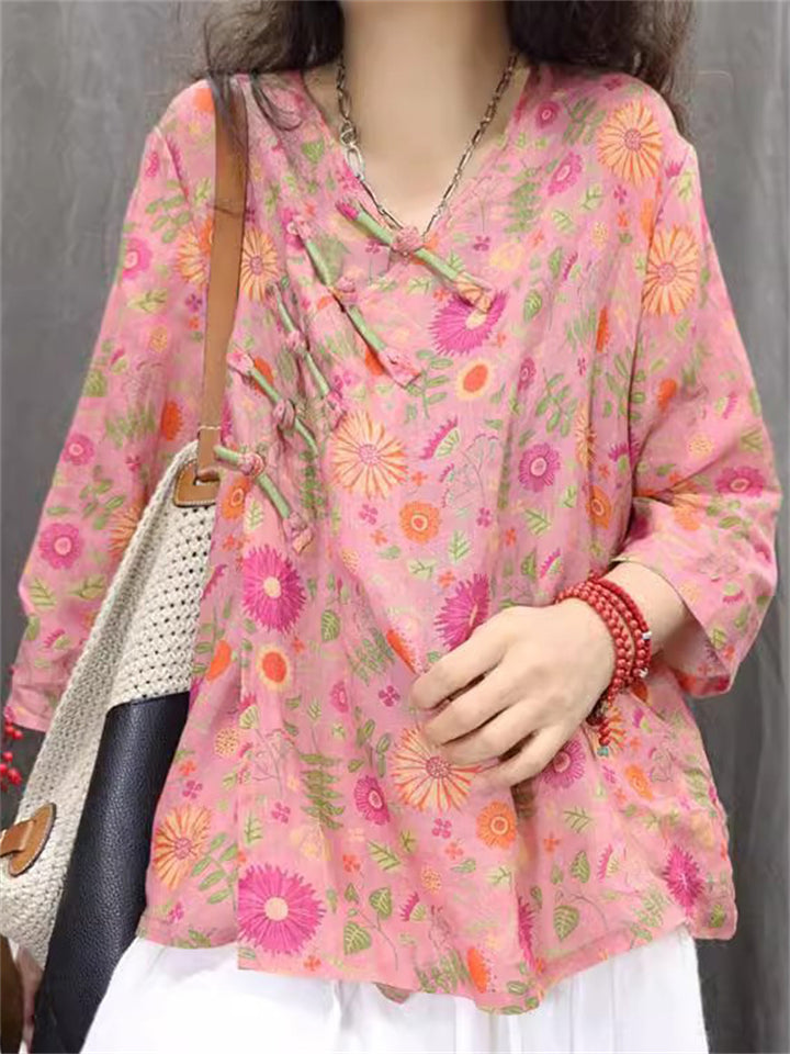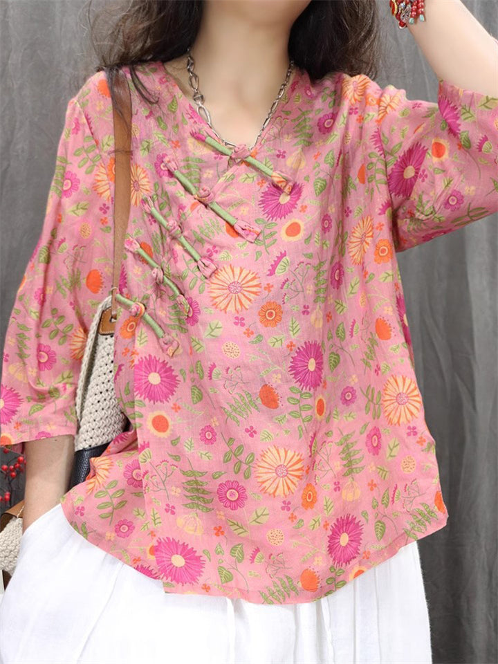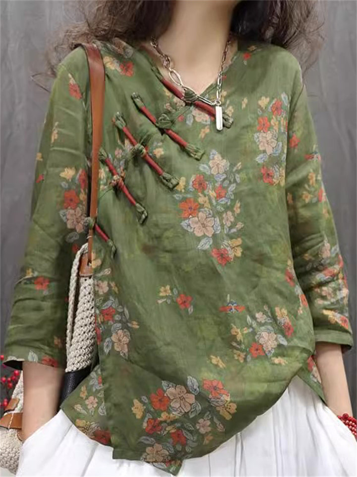 Ancient Chinese Style Floral Embroidery Linen Shirt for Women