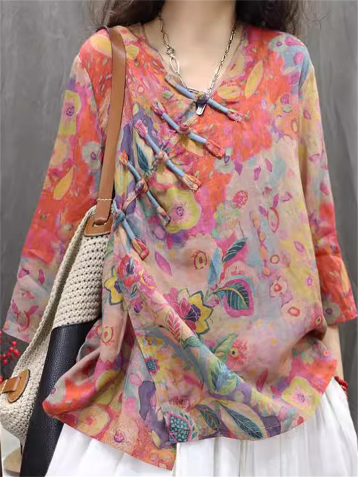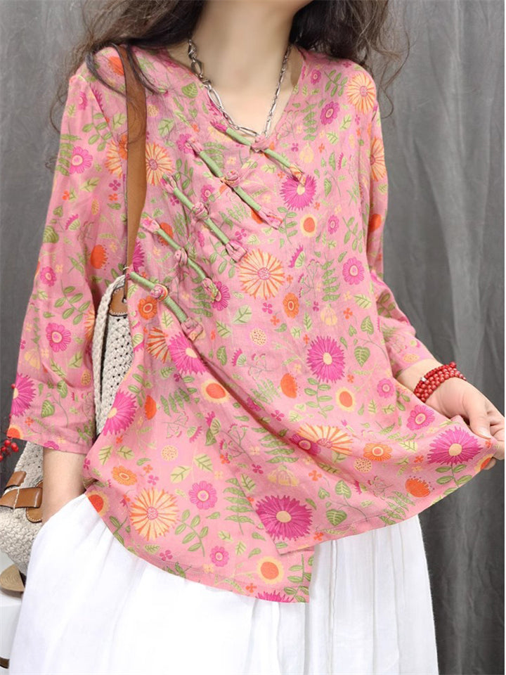 Lady Stand-up Collar Floral Printed Chinese Style Shirts