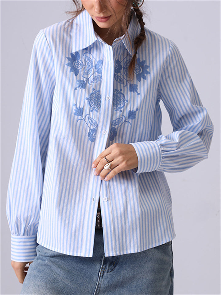 Women's Elegant Autumn Cotton Striped Hollow Stand Collar Long Sleeve Shirts