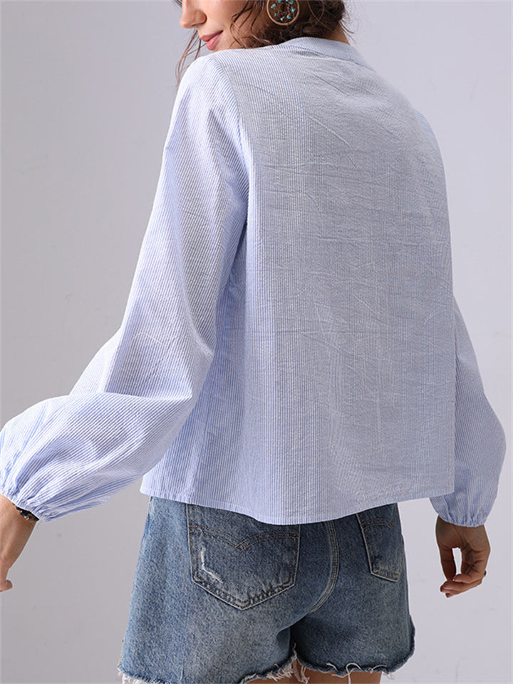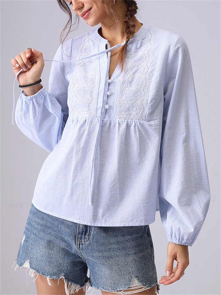 Women's Elegant Autumn Cotton Striped Hollow Stand Collar Long Sleeve Shirts