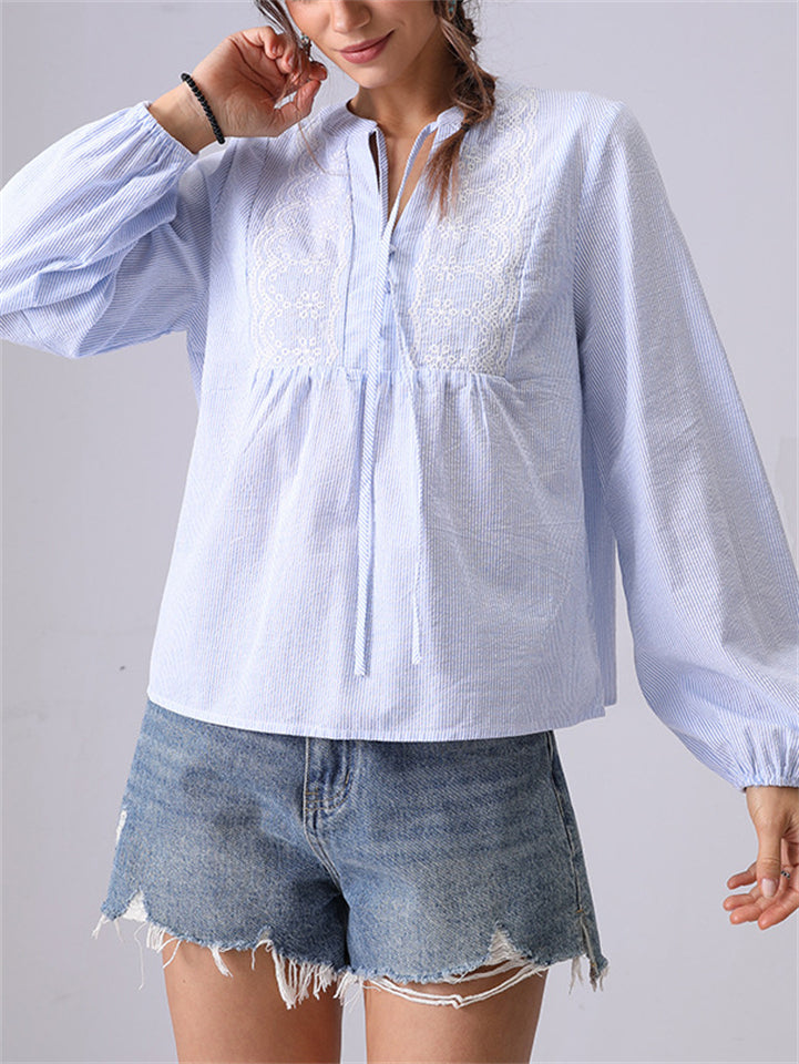 Women's French Style Embroidery Blue Stripe Shirts