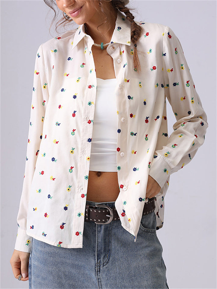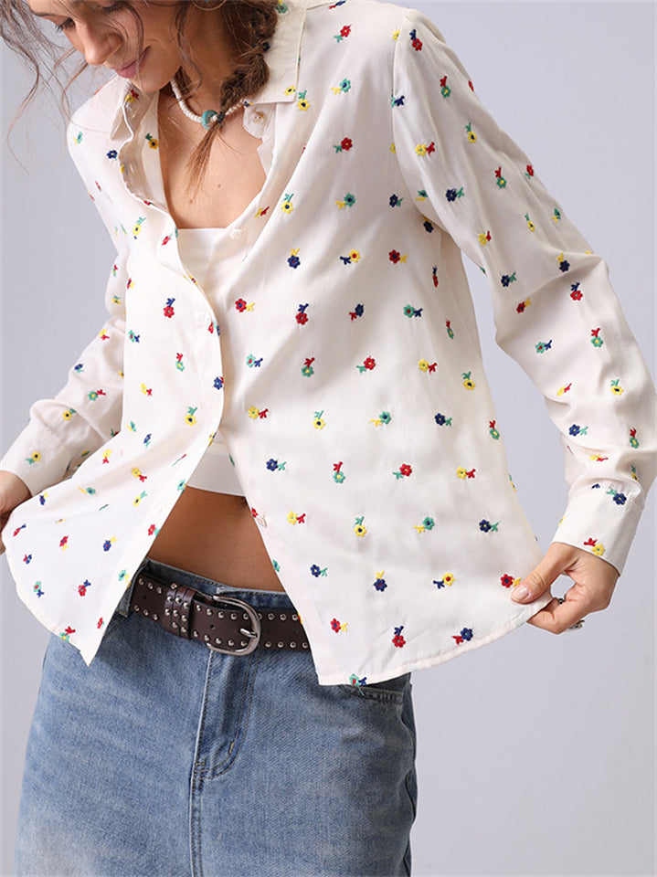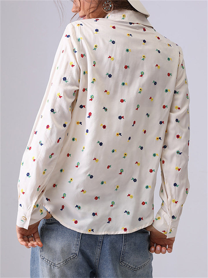 Women's French Style Flowers Embroidery Cotton Lapel Shirt