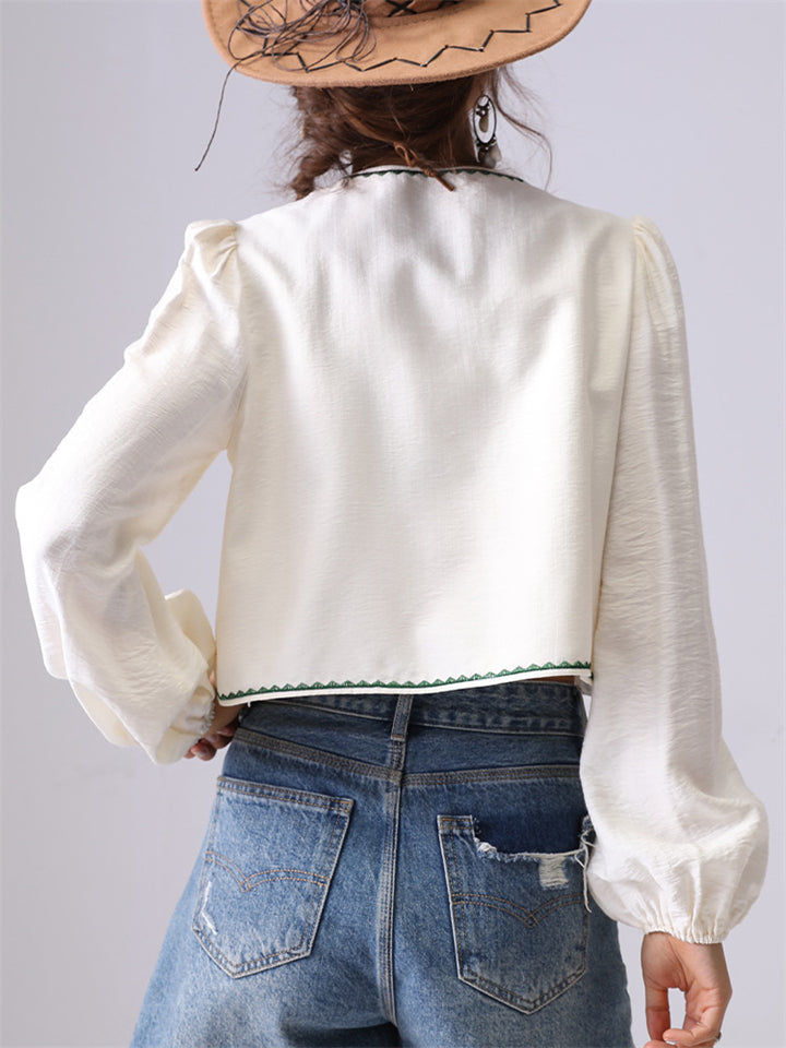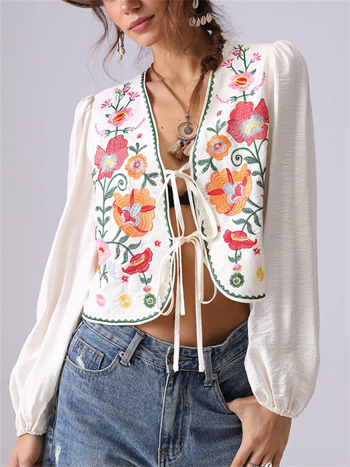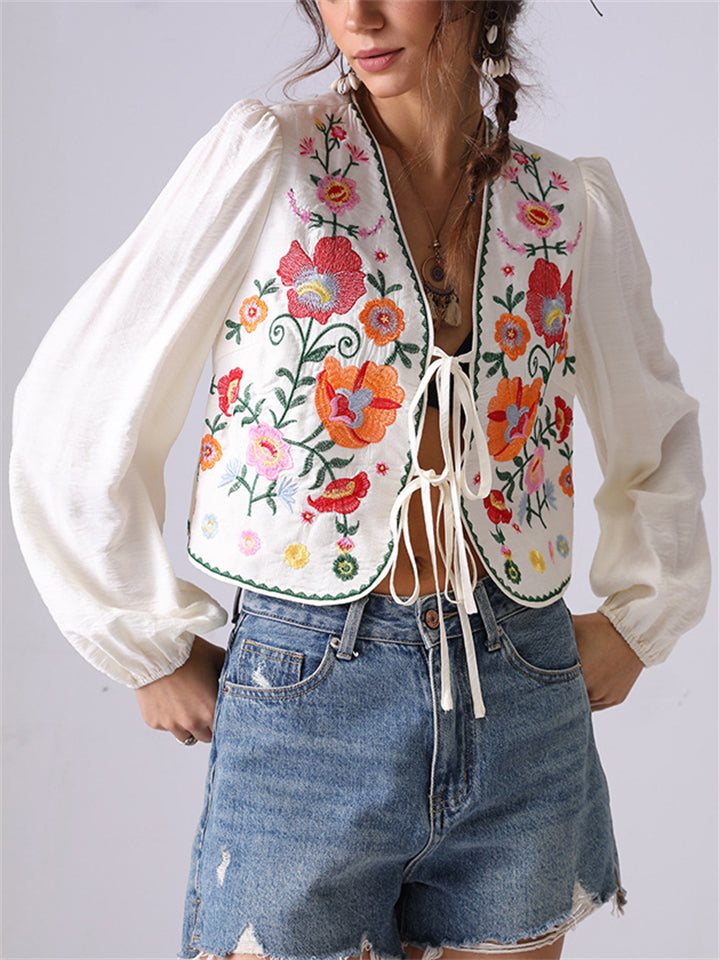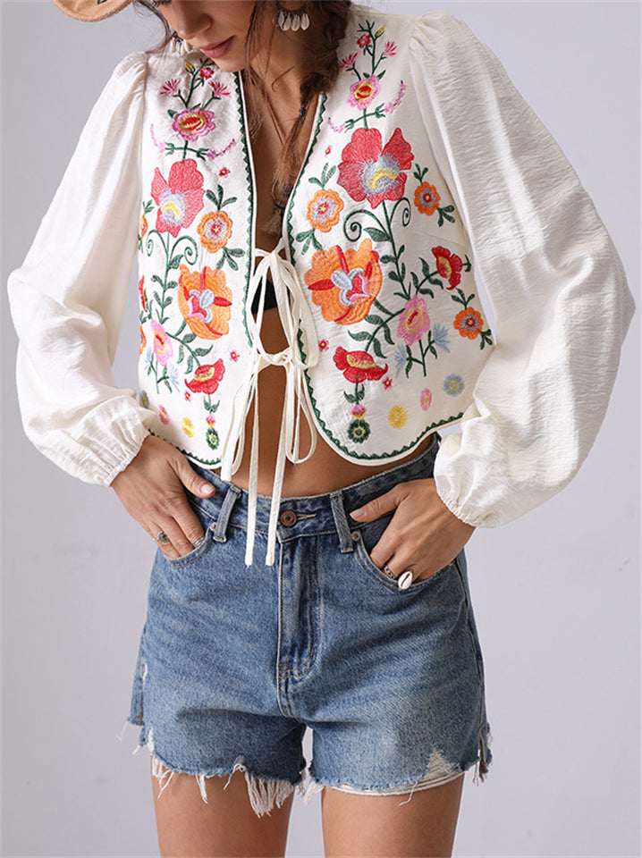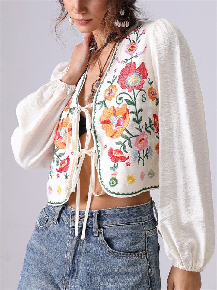 Women's French Style Flowers Embroidery Lace Up Cardigan Shirt