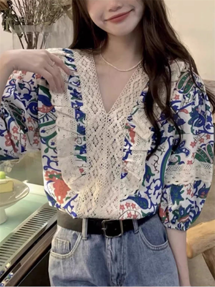 Women's French Style Summer Printed Lace Patchwork Puffed Sleeve Shirts