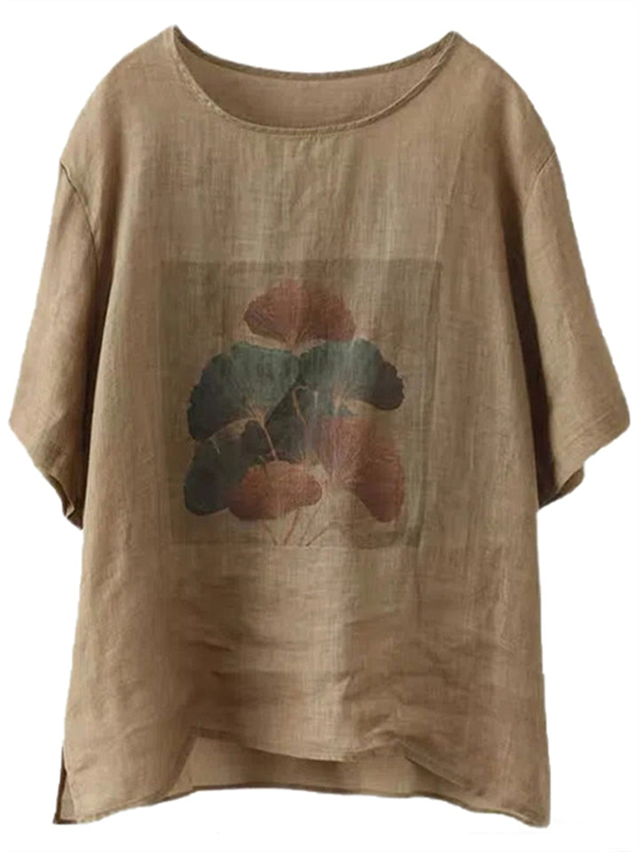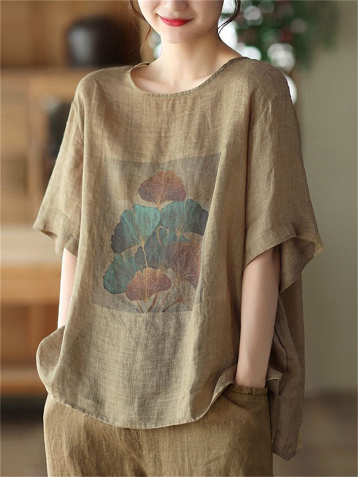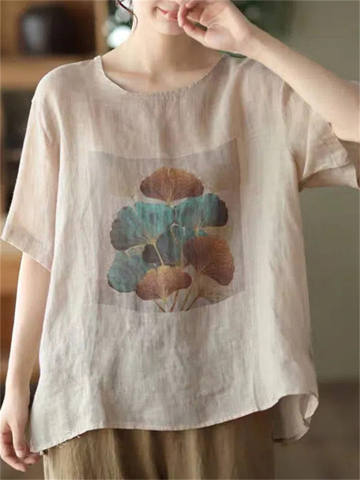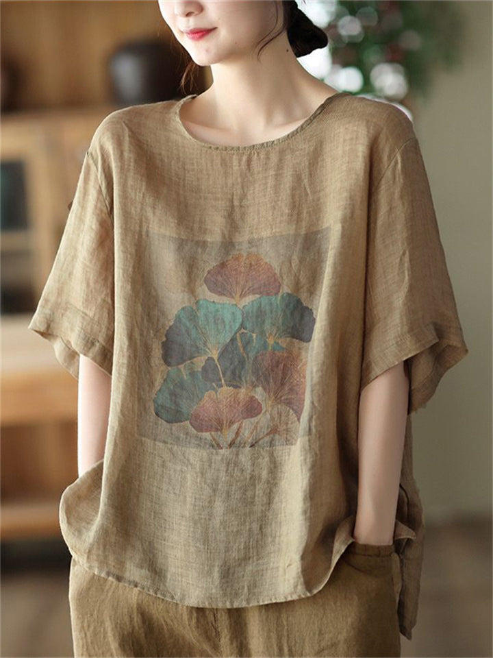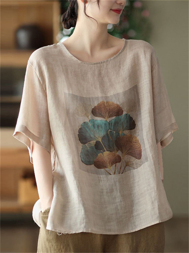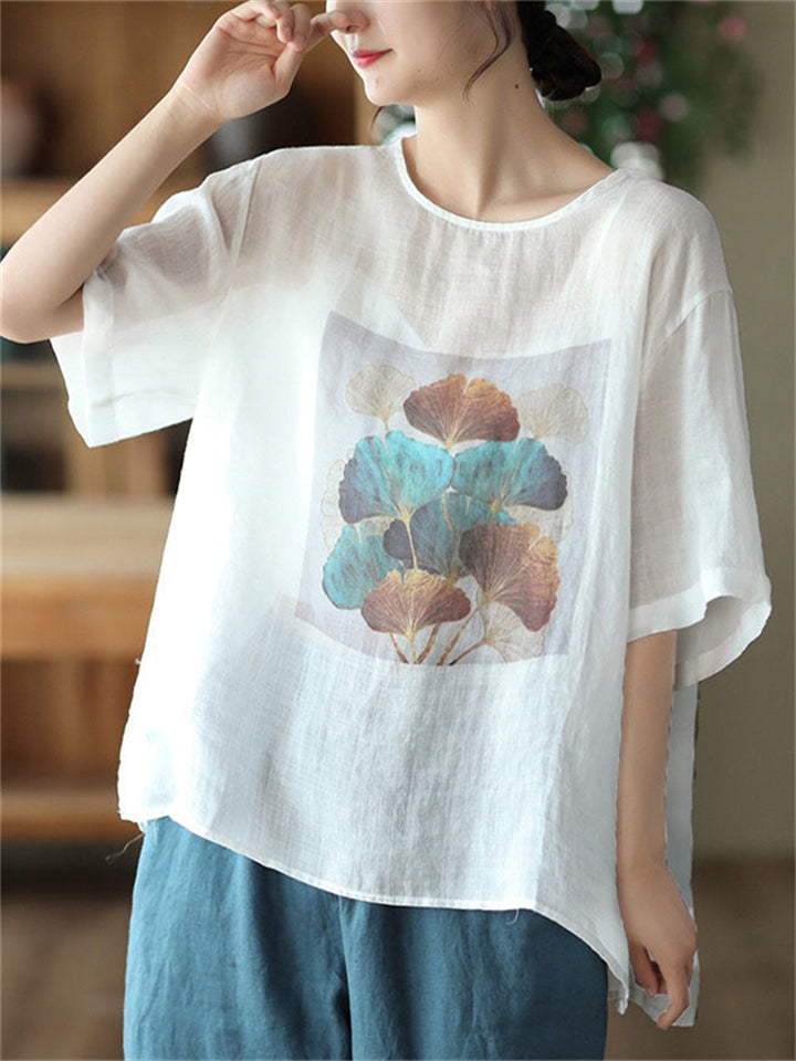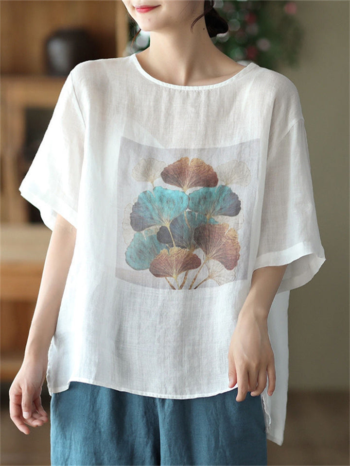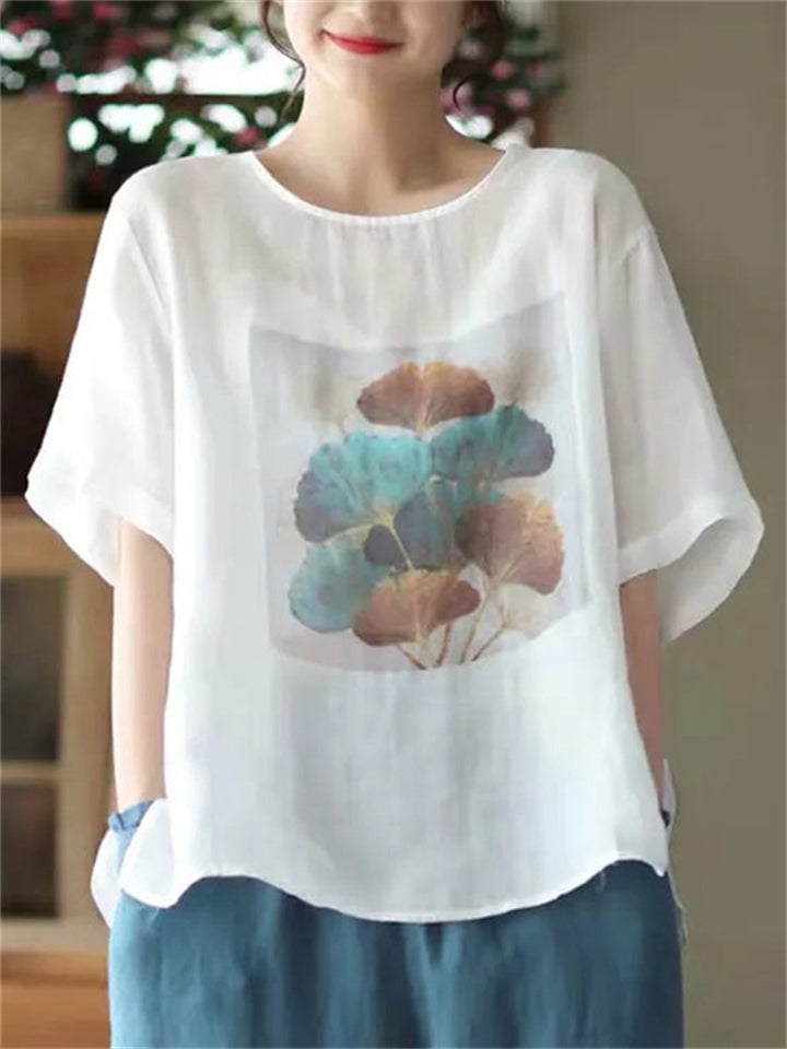 Women's Ginkgo Leaf Printed Round Collar Short Sleeve Shirt