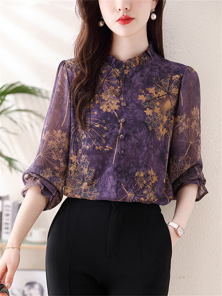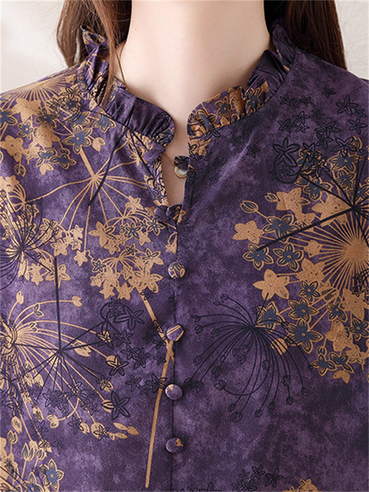 Lady Stand-up Collar Floral Printed Chinese Style Shirts