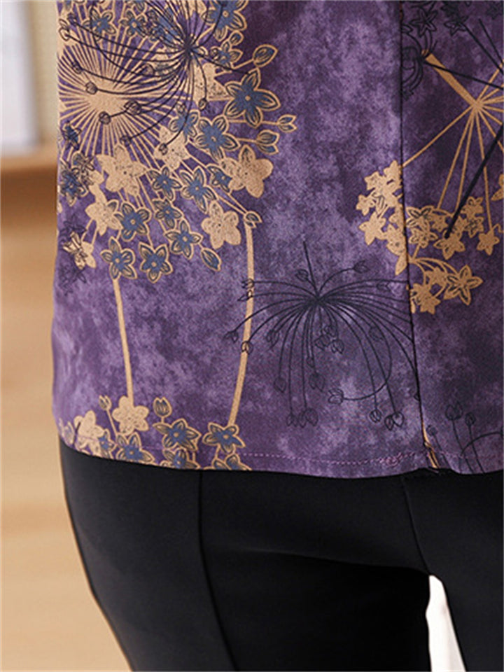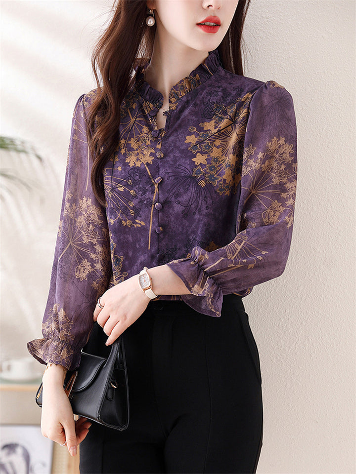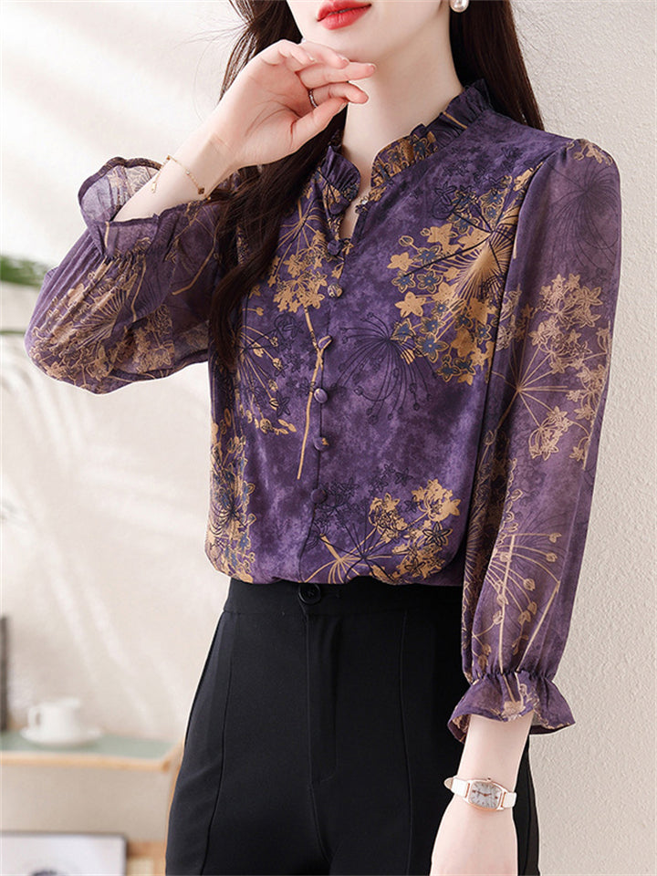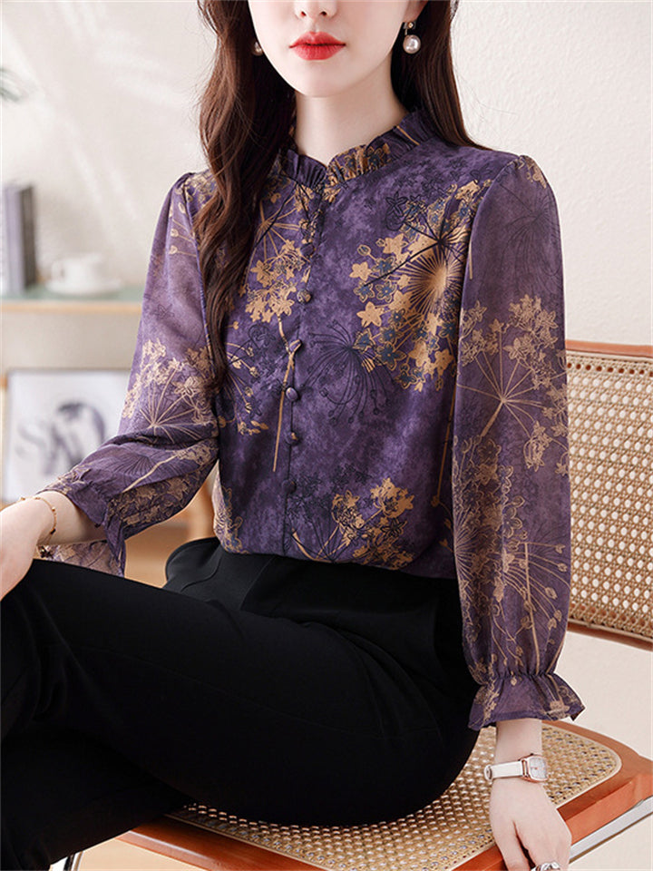 Women's Gold Floral Print Stand Collar Long Sleeve Purple Shirt