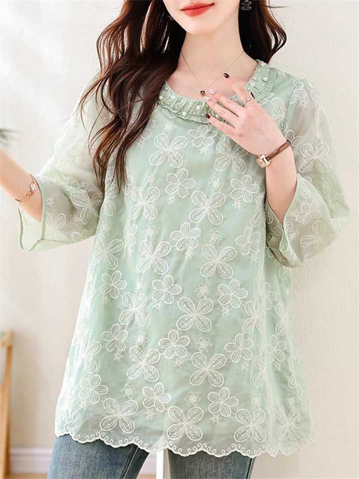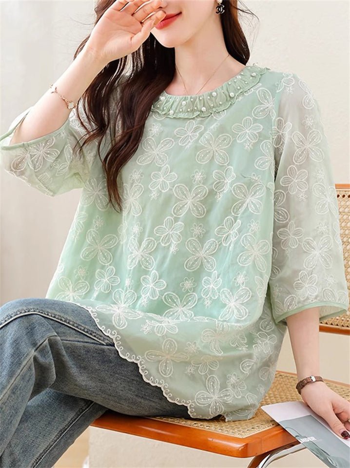 Women's Green 3/4 Sleeve Round Neck Beads Patchwork Shirts