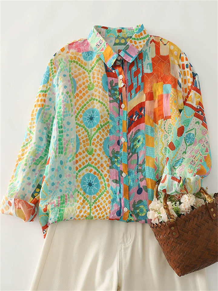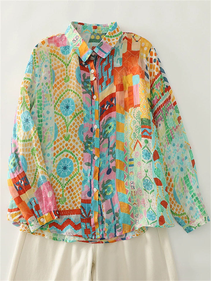 Women's Casual Retro Printed Long Sleeve Lapel Shirts