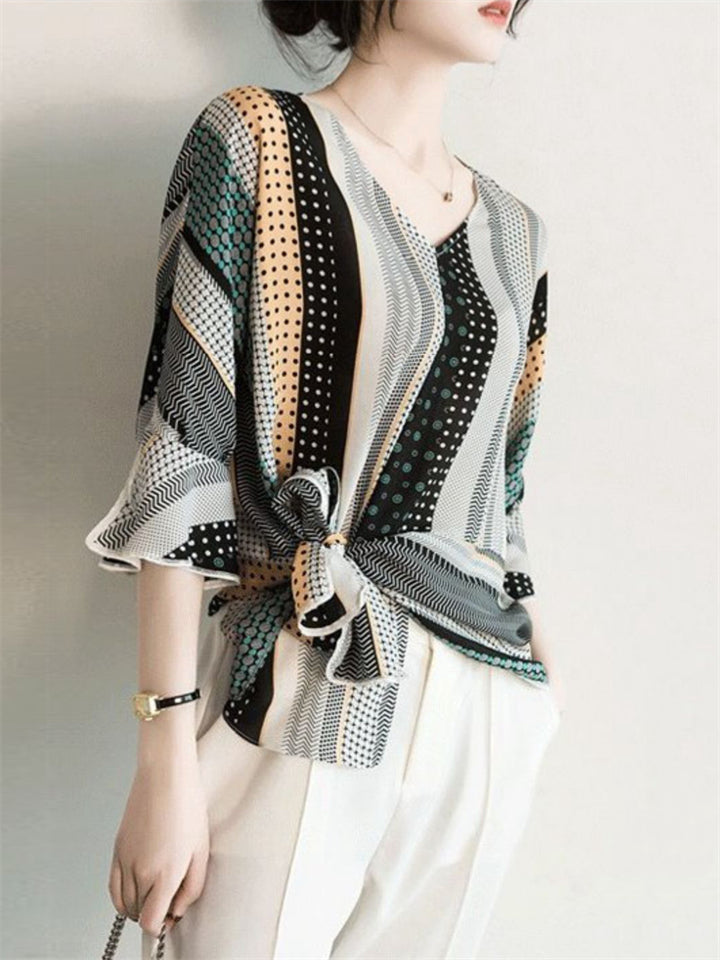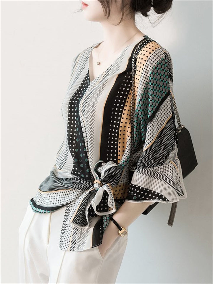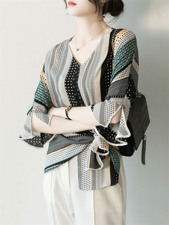 Women's Irregular Patchwork Color Print V-Neck Flared Sleeve Shirt