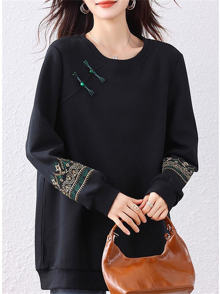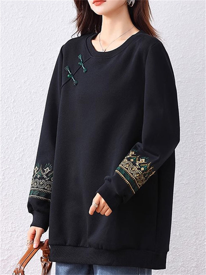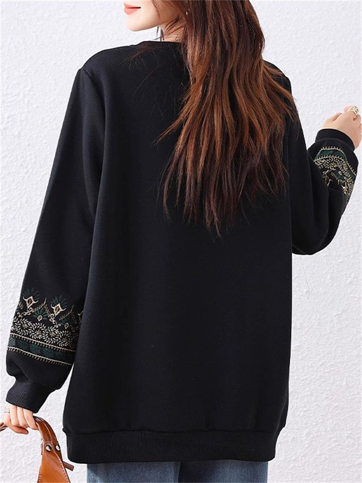 Women's Loose Black Embroidery O-Neck Pullover Sweatshirt
